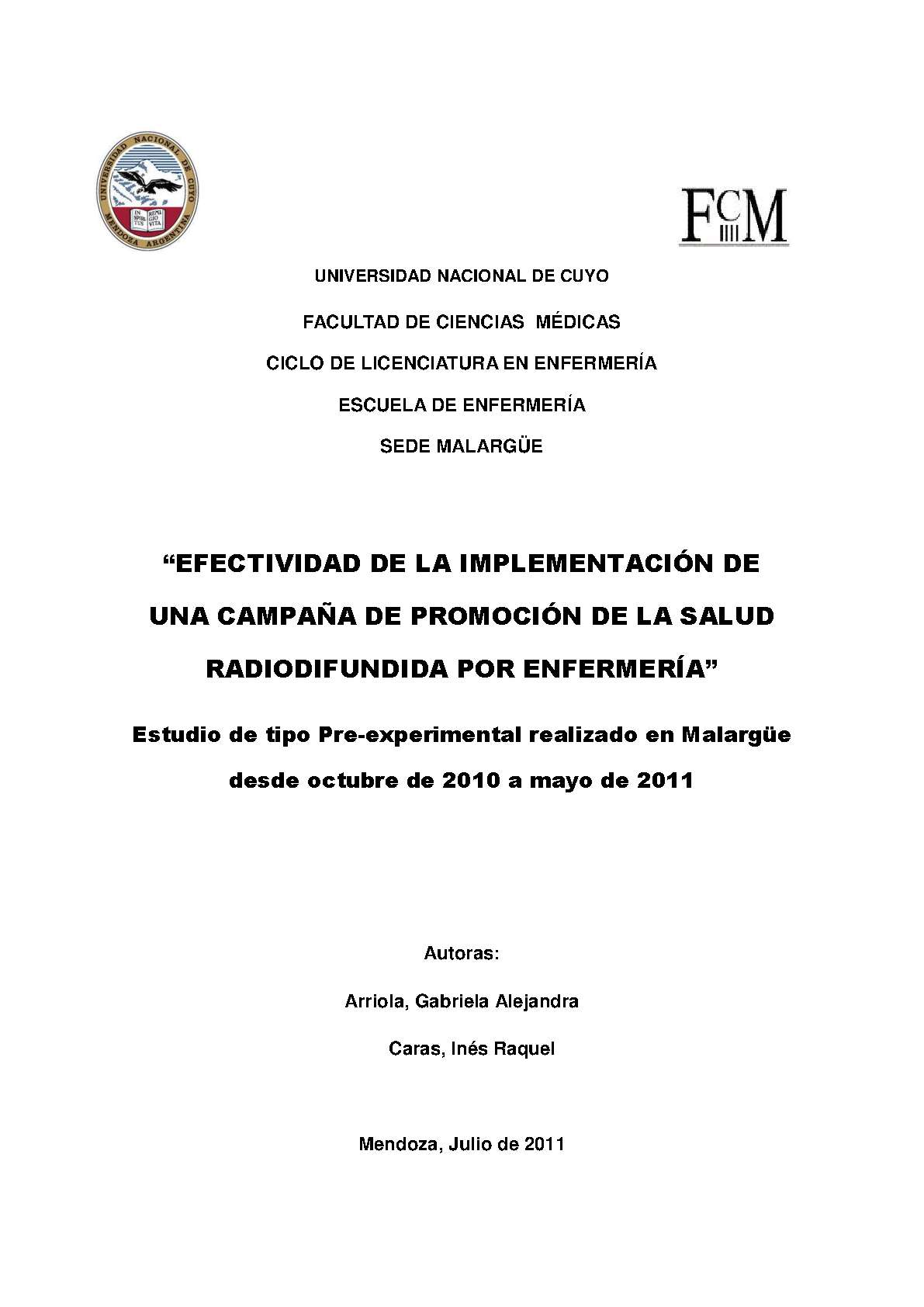 estudio de tipo pre-experimental realizado en Malargüe desde octubre de 2010 a mayo de 2011