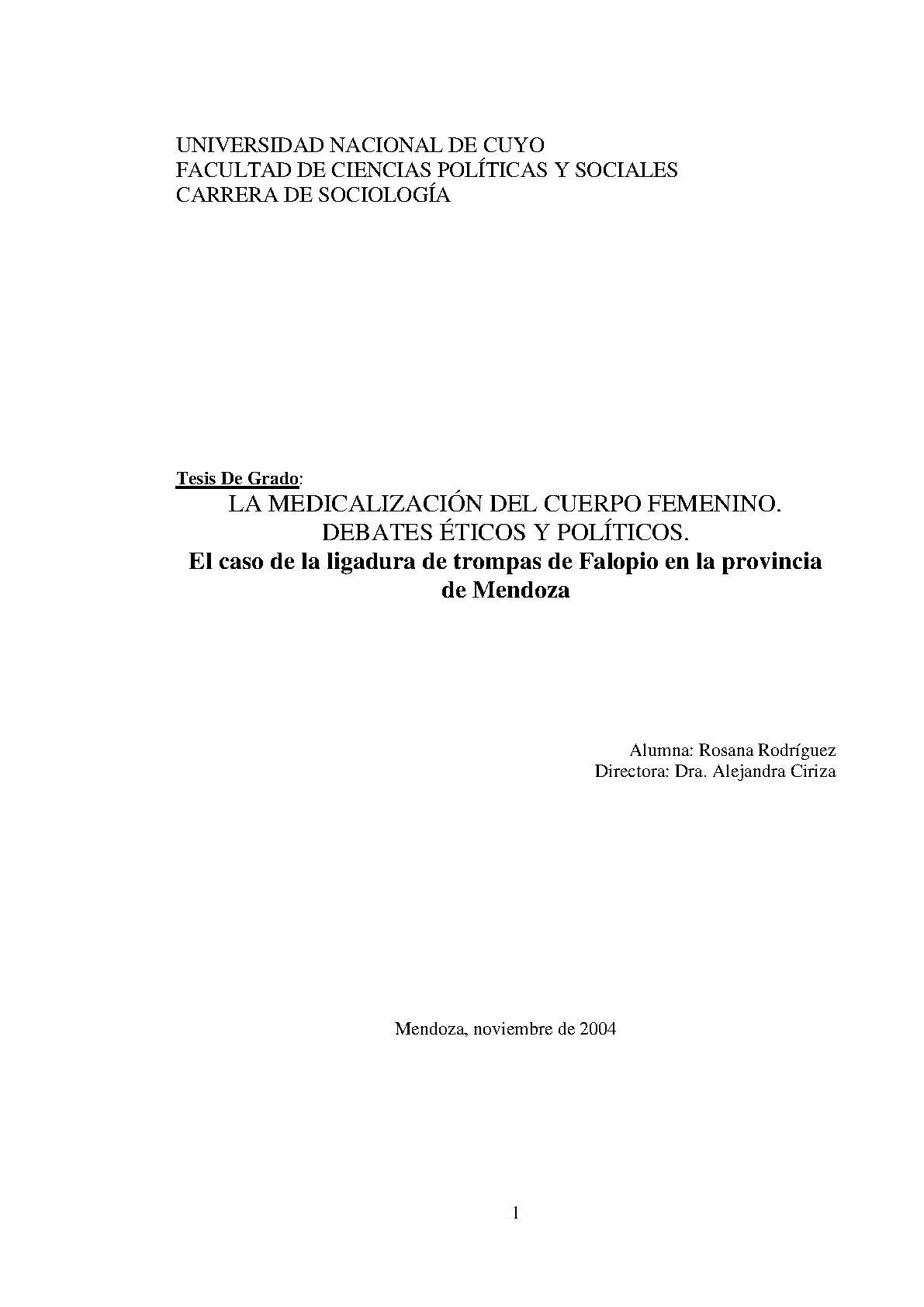 Este trabajo se centra en la experiencia realizada en Hospital Luis Lagomaggiore, donde funciona el centro ginecológico-obstétrico más importante de la provincia de Mendoza, para evaluar la ética del modelo médico hegemónico en el manejo y administración del cuerpo de las mujeres, explorar la relación concreta entre medicina y cuerpo femenino a partir del análisis de las posiciones políticas, éticas y morales en torno al caso particular de la ligadura tubaria, e interpretar cómo funcionan los principios bioéticos de beneficencia, autonomía y de justicia en la atención pública y en las prácticas de salud sexual y reproductivas, en especial en las intervenciones de ligadura.
