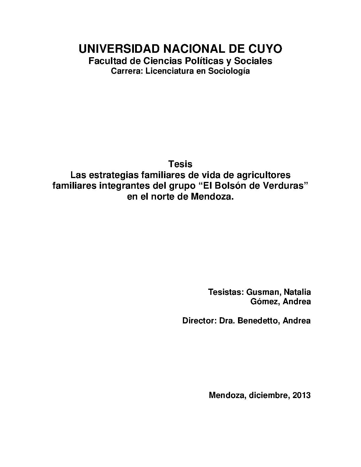 Gusmán, Natalia; Gómez, Andrea. (2013). Las estrategias familiares de vida de agricultores familiares integrantes del grupo "El Bolsón de Verduras" en el norte de Mendoza: (Tesina de grado). Mendoza, Universidad Nacional de Cuyo. Facultad de Ciencias Políticas y Sociales .