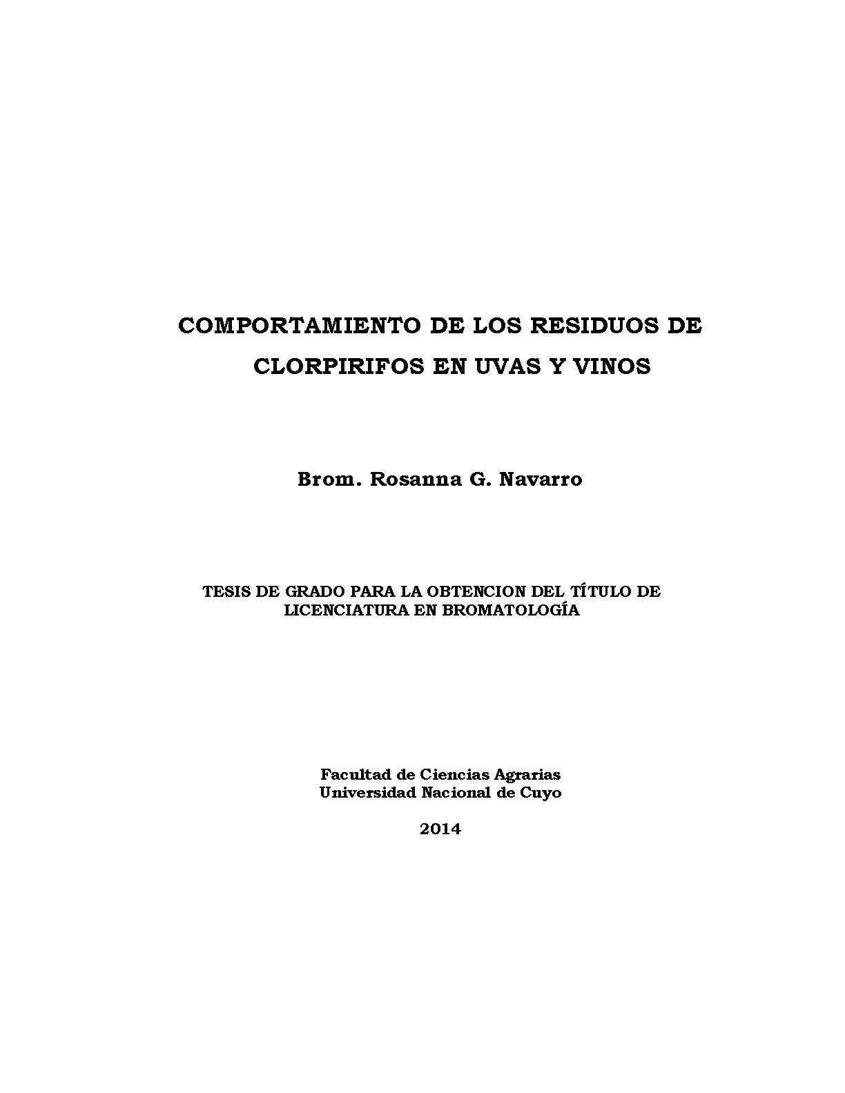 Navarro, Rosanna G.. (2014). Comportamiento de los residuos de clorpirifos en uvas y vinos: (Tesina de grado). Mendoza, Universidad Nacional de Cuyo. Facultad de Ciencias Agrarias .
