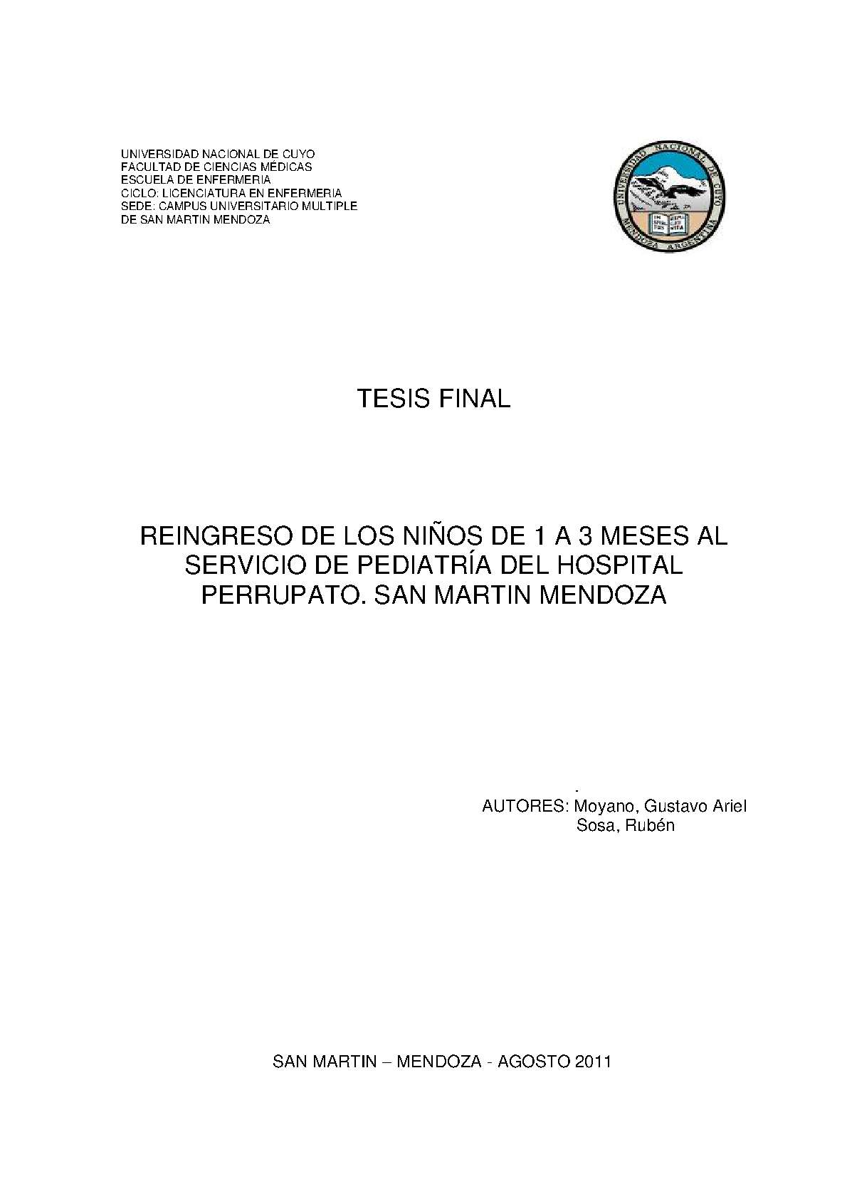 Moyano, Gustavo Ariel; Sosa, Rubén. (2011). Reingreso de los niños de 1 a 3 meses al servicio de pediatría del Hospital Perrupato, San Martín, Mendoza: (Tesina de grado). Mendoza, Universidad Nacional de Cuyo. Facultad de Ciencias Médicas. Escuela de Enfermería..