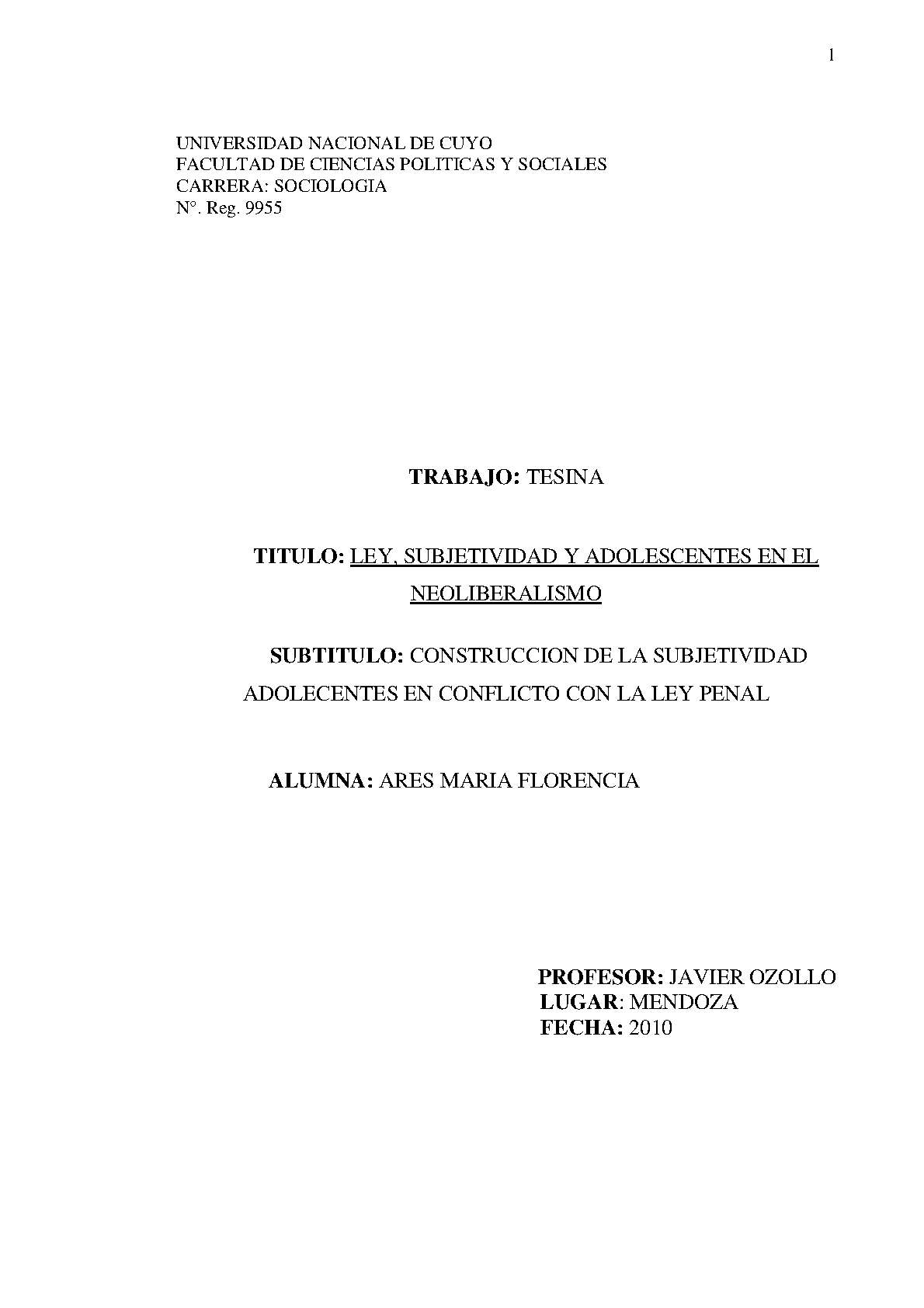 Ares, María Florencia. (2010). Ley, subjetividad y adolescentes en el neoliberalismo: construcción de la subjetividad : adolescentes en conflicto con la ley penal (Tesina de grado). Mendoza, Universidad Nacional de Cuyo. Facultad de Ciencias Políticas y Sociales .