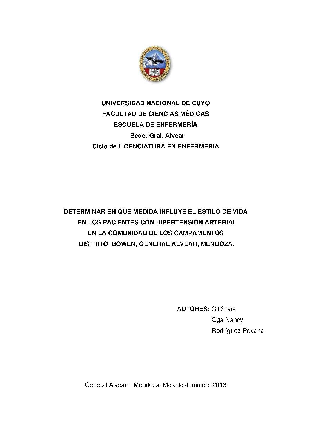 Gil, Silvia; Oga, Nancy; Rodríguez, Roxana. (2013). Determinar en qué medida influye el estilo de vida en los pacientes con hipertensión arterial en la comunidad de Los Campamentos, distrito de Bowen, General Alvear, Mendoza.: (Tesina de grado). Mendoza, Universidad Nacional de Cuyo. Facultad de Ciencias Médicas. Escuela de Enfermería..