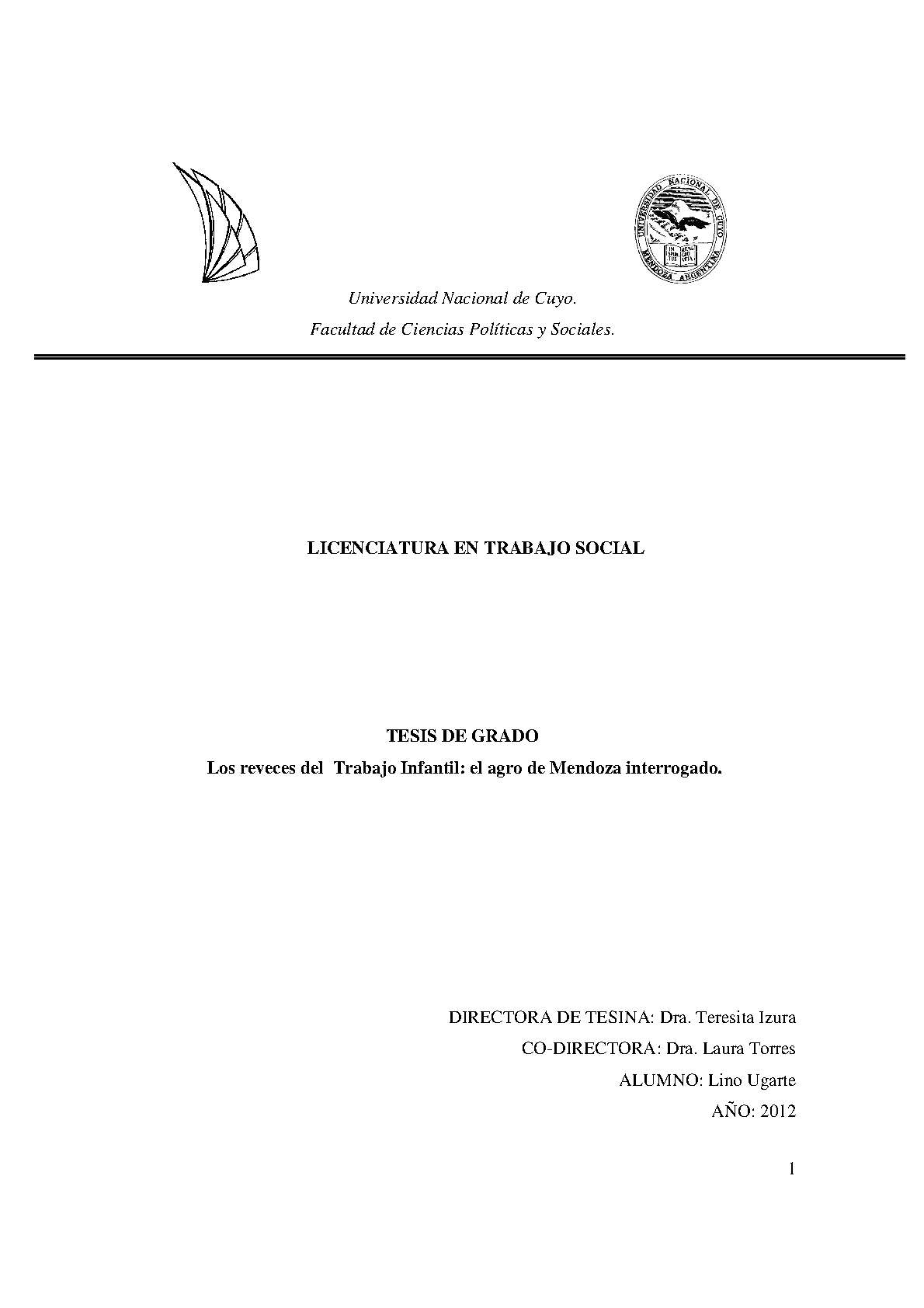 Ugarte, Lino. (2012). Los reveces del trabajo infantil: el agro de Mendoza interrogado (Tesina de grado). Mendoza, Universidad Nacional de Cuyo. Facultad de Ciencias Políticas y Sociales .