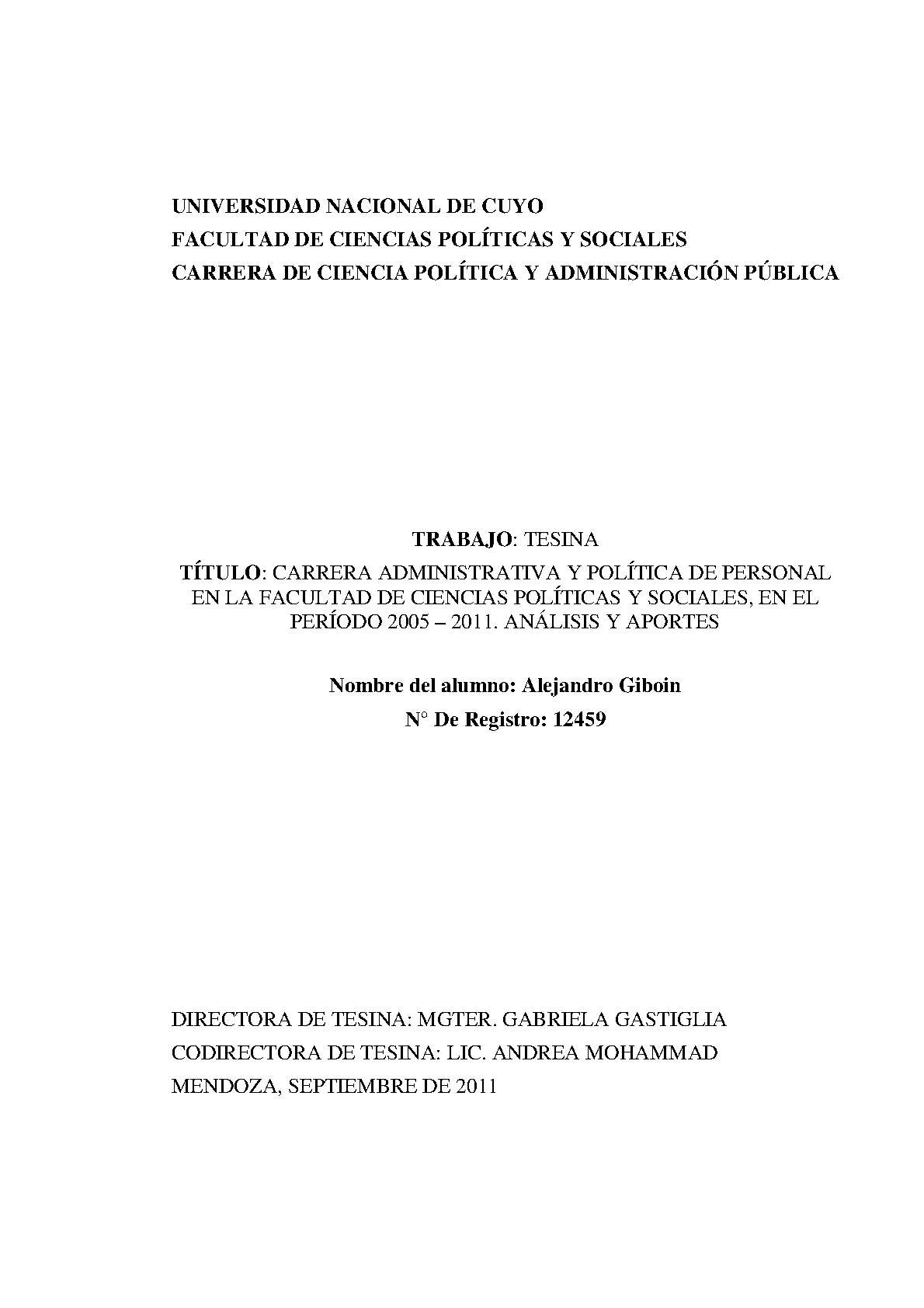Giboin, Alejandro. (2011). Carrera administrativa y política de personal en la Facultad de Ciencias Políticas y Sociales, en el período 2005-2011: análisis y aportes (Tesina de grado). Mendoza, Universidad Nacional de Cuyo. Facultad de Ciencias Políticas y Sociales .