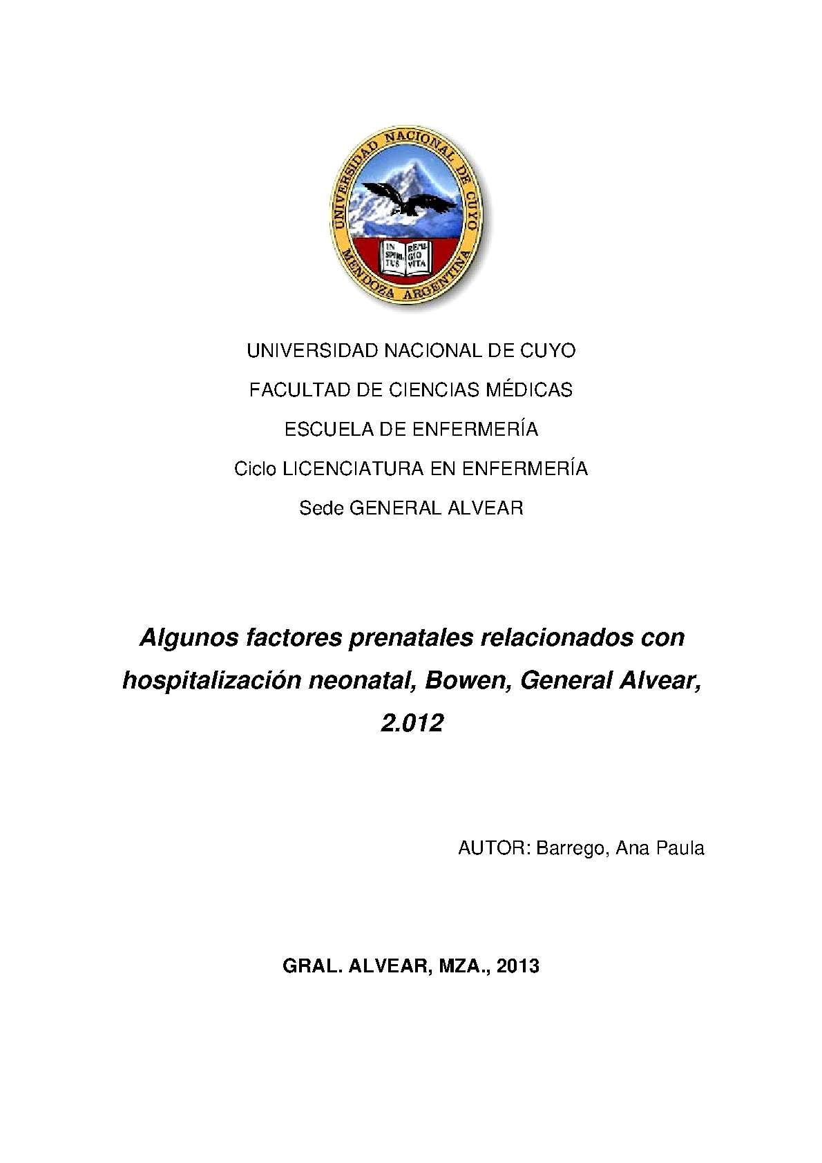 Barrego, Ana Paula. (2013). Algunos factores prenatales relacionados con hospitalización neonatal, Bowen, General Alvear, 2012: (Tesina de grado). Mendoza, Universidad Nacional de Cuyo. Facultad de Ciencias Médicas. Escuela de Enfermería..