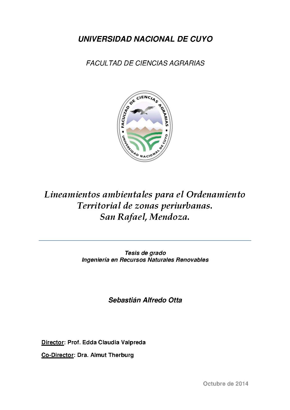 El objetivo del presente trabajo es definir una serie de lineamientos ambientales para el Ordenamiento Territorial de las zonas periurbanas del Oeste de la ciudad de San Rafael. Para el logro de este objetivo, se estudian los múltiples enfoques y concepciones en torno al Ordenamiento Territorial, así como el marco jurídico–administrativo vigente en la provincia de Mendoza y, particularmente, el departamento de San Rafael. Posteriormente se realiza un análisis exclusivamente de la dimensión ambiental, la cual se identifica como uno de los componentes esenciales de los actuales procesos de Ordenamiento Territorial enfocados al desarrollo sustentable.
