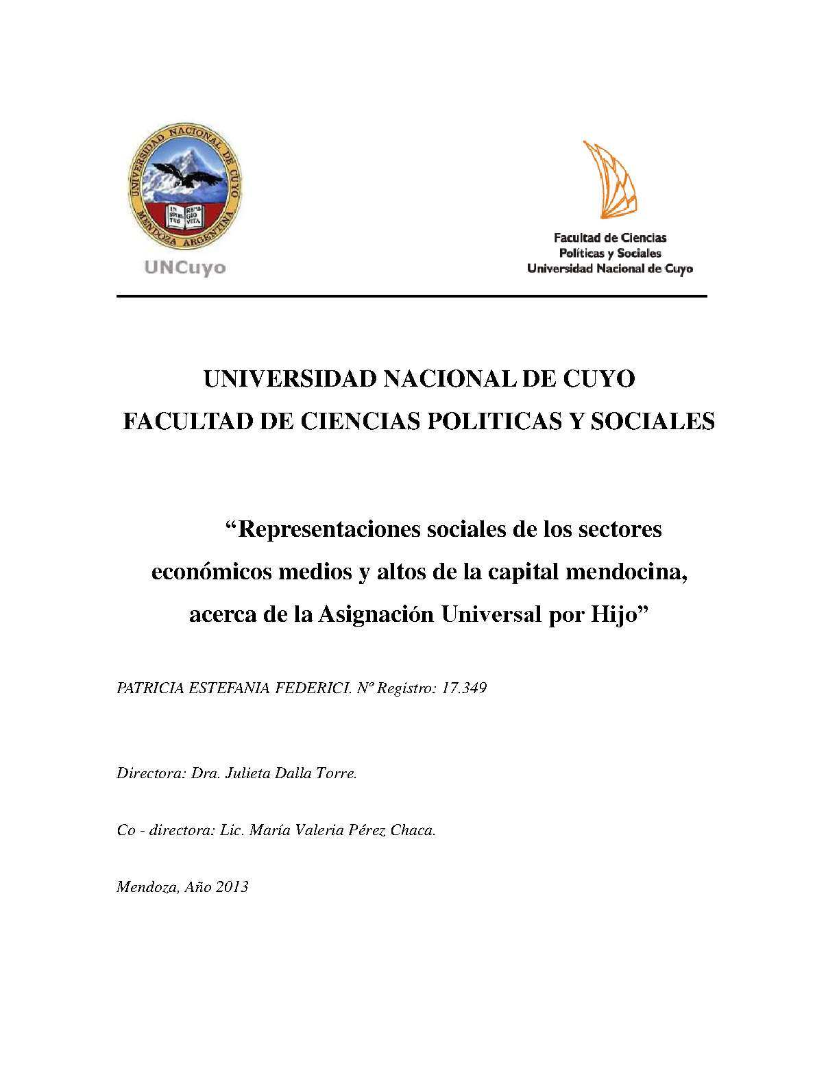 El objetivo general de este trabajo es comprender y analizar las representaciones sociales de los sectores sociales medios y altos de la población de la capital mendocina, en relación a los objetivos de la Asignación Universal por Hijo (AUH) y sus destinatarios, durante el primer semestre del año 2013.