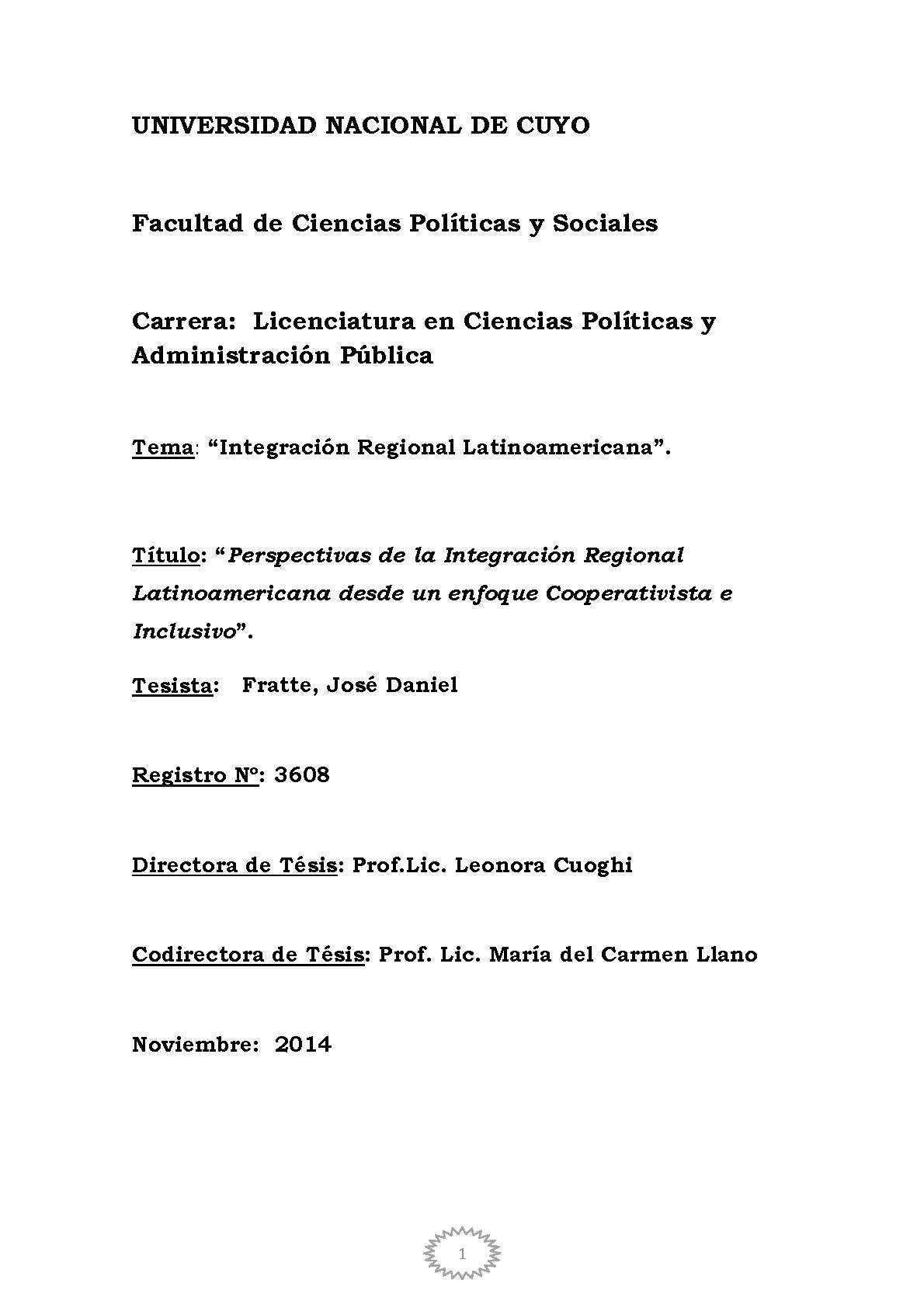 Fratte, José Daniel. (2014). Perspectivas de la integración regional latinoamericana desde un enfoque cooperativista e inclusivo: (Tesina de grado). Mendoza, Universidad Nacional de Cuyo. Facultad de Ciencias Políticas y Sociales .
