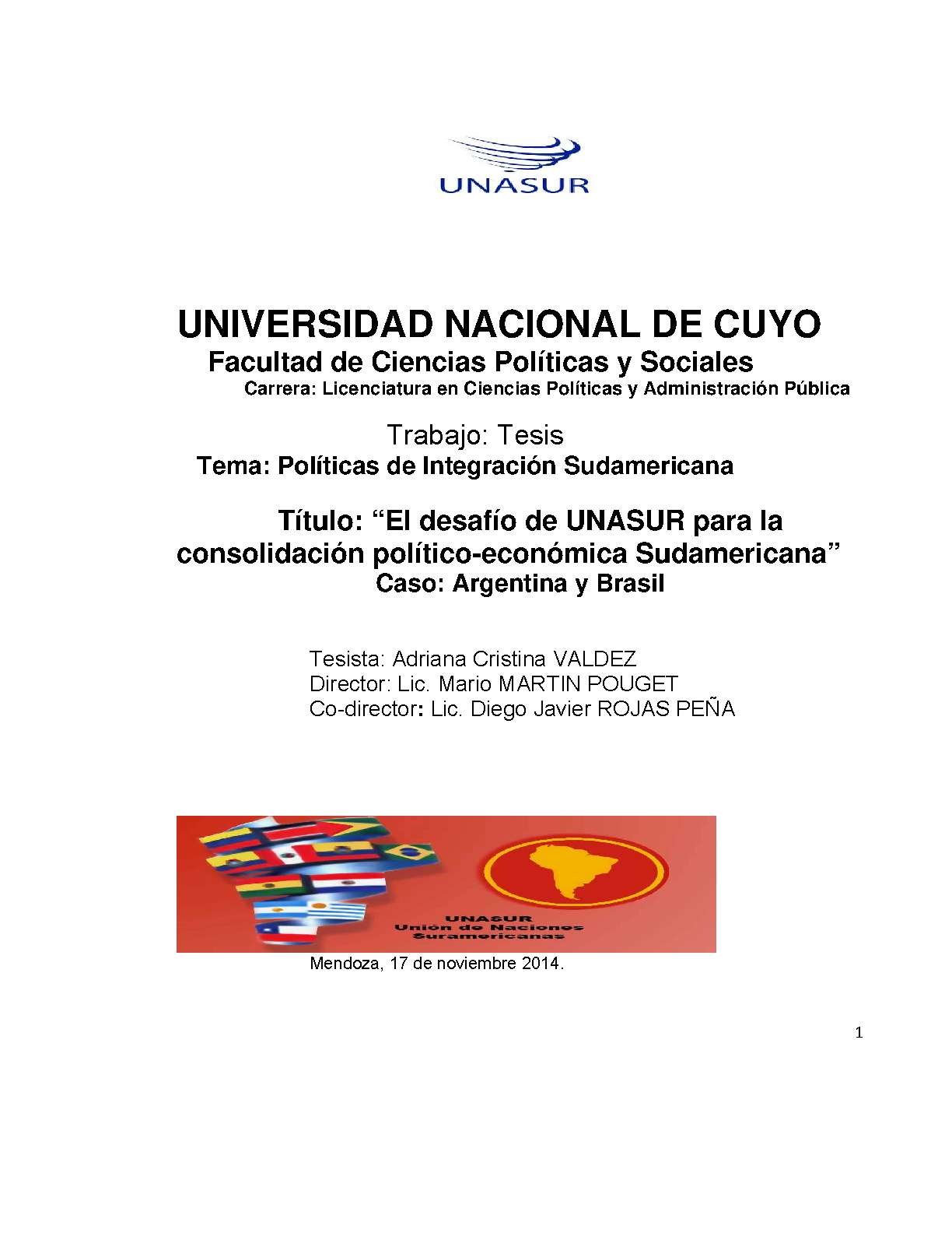 Valdez, Adriana Cristina. (2014). El desafío de UNASUR para la consolidación político-económica sudamericana: caso: Argentina y Brasil (Tesina de grado). Mendoza, Universidad Nacional de Cuyo. Facultad de Ciencias Políticas y Sociales .