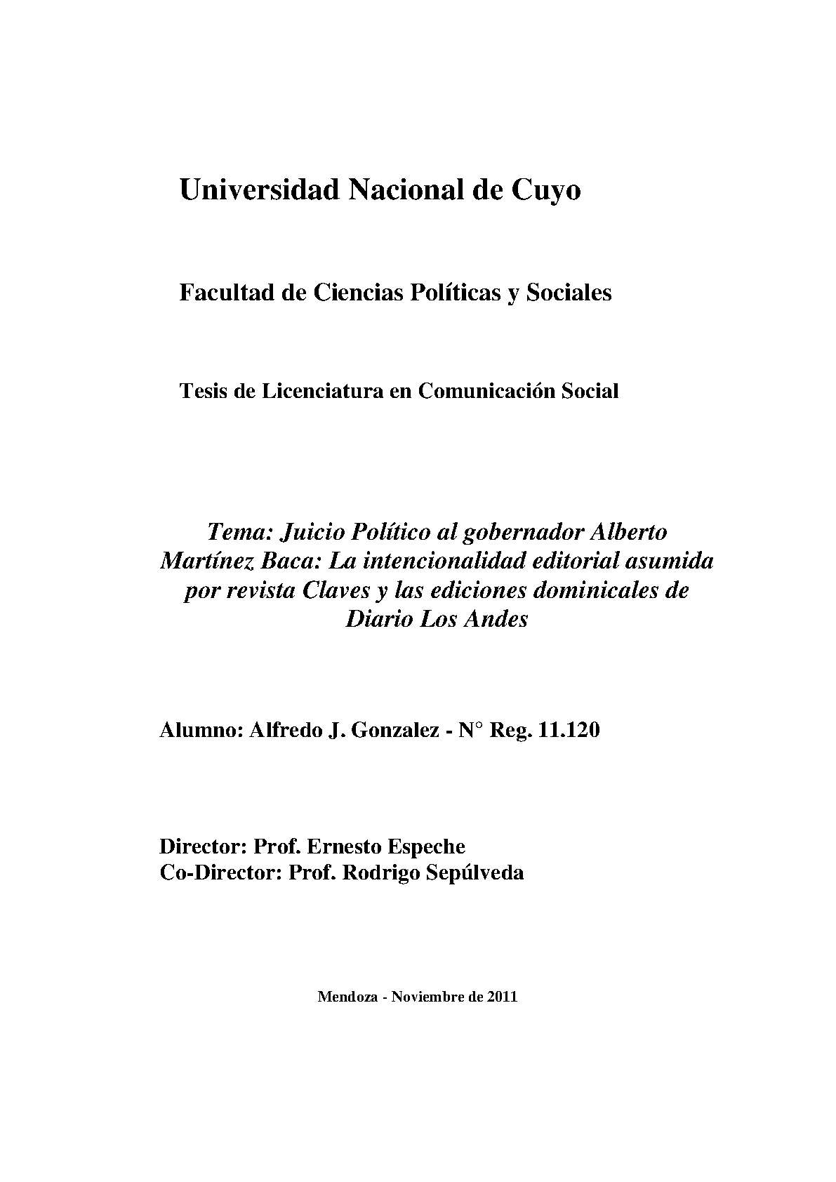 En el presente estudio se pretende analizar, cómo se reflejaron, en el diario Los Andes (en sus ediciones dominicales) y la quincenal revista de análisis político y de interés general “Claves", los hechos sucedidos en la provincia relacionados a la destitución del gobernador de la provincia, Alberto Martínez Baca (1973-1974), después de realizársele un proceso de juicio político en su contra, respecto a actividades con supuestas irregularidades, en principio sobre un proceso de compra de vinos por la entonces empresa estatal Bodegas y Viñedos Giol. En este sentido, se le dio curso a la figura de juicio político contemplada en la Constitución Provincial en su artículo n° 109 por el cual podía, en el peor de los casos para quien es acusado, ser destituido.