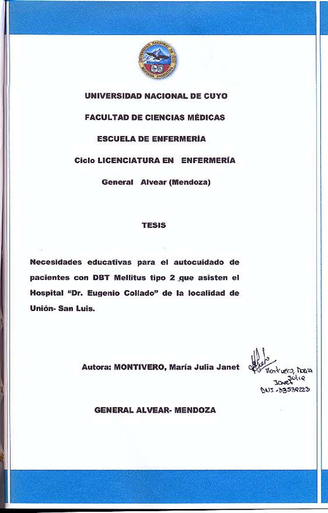 Montivero, María Julia Janet. (2013). Necesidades educativas para el autocuidado de pacientes con DBT Mellitus tipo 2 que asisten el Hospital Dr. Eugenio Collado de la localidad de Unión, San Luis: (Tesina de grado). Mendoza, Universidad Nacional de Cuyo. Facultad de Ciencias Médicas. Escuela de Enfermería..