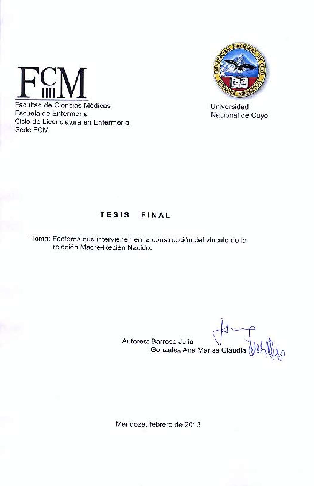 Barroso, Julia; González, Ana Marisa Claudia. (2013). Factores que intervienen en la construcción del vínculo de la relación madre-recién nacido: (Tesina de grado). Mendoza, Universidad Nacional de Cuyo. Facultad de Ciencias Médicas. Escuela de Enfermería..