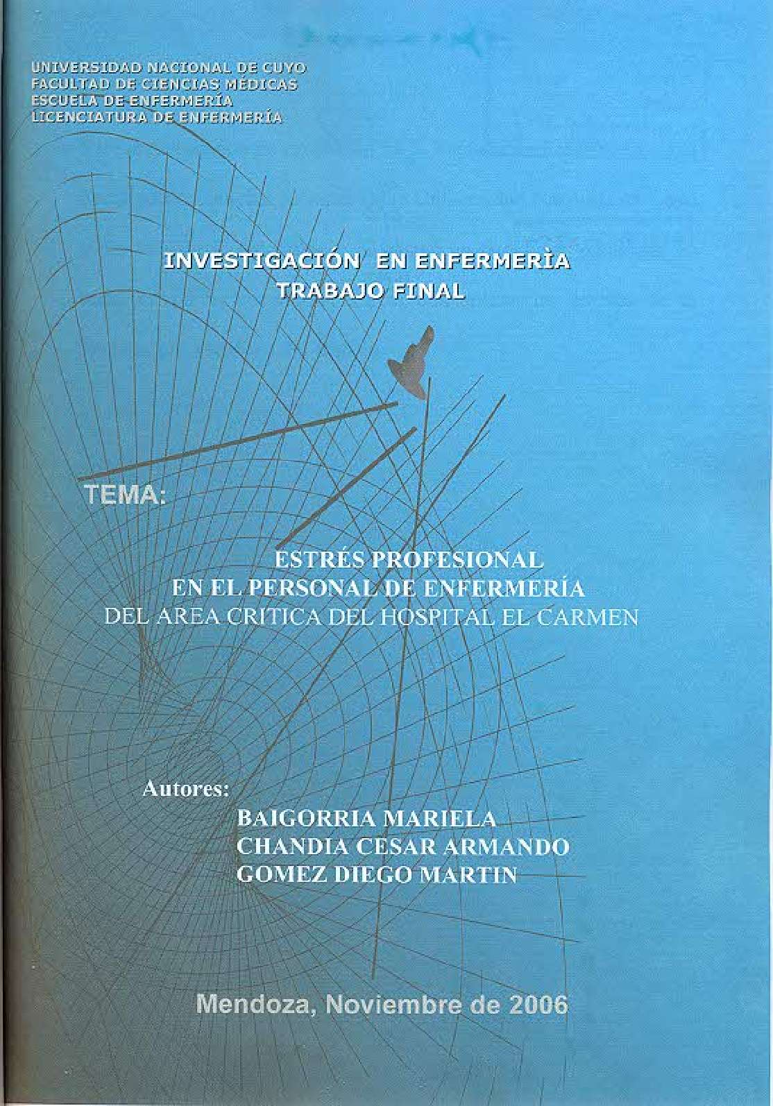 Baigorria, Mariela; Chandía, César Armando; Gómez, Diego Martín. (2006). Estrés profesional en el personal de enfermería del área crítica del Hospital El Carmen: (Tesina de grado). Mendoza, Universidad Nacional de Cuyo. Facultad de Ciencias Médicas. Escuela de Enfermería..