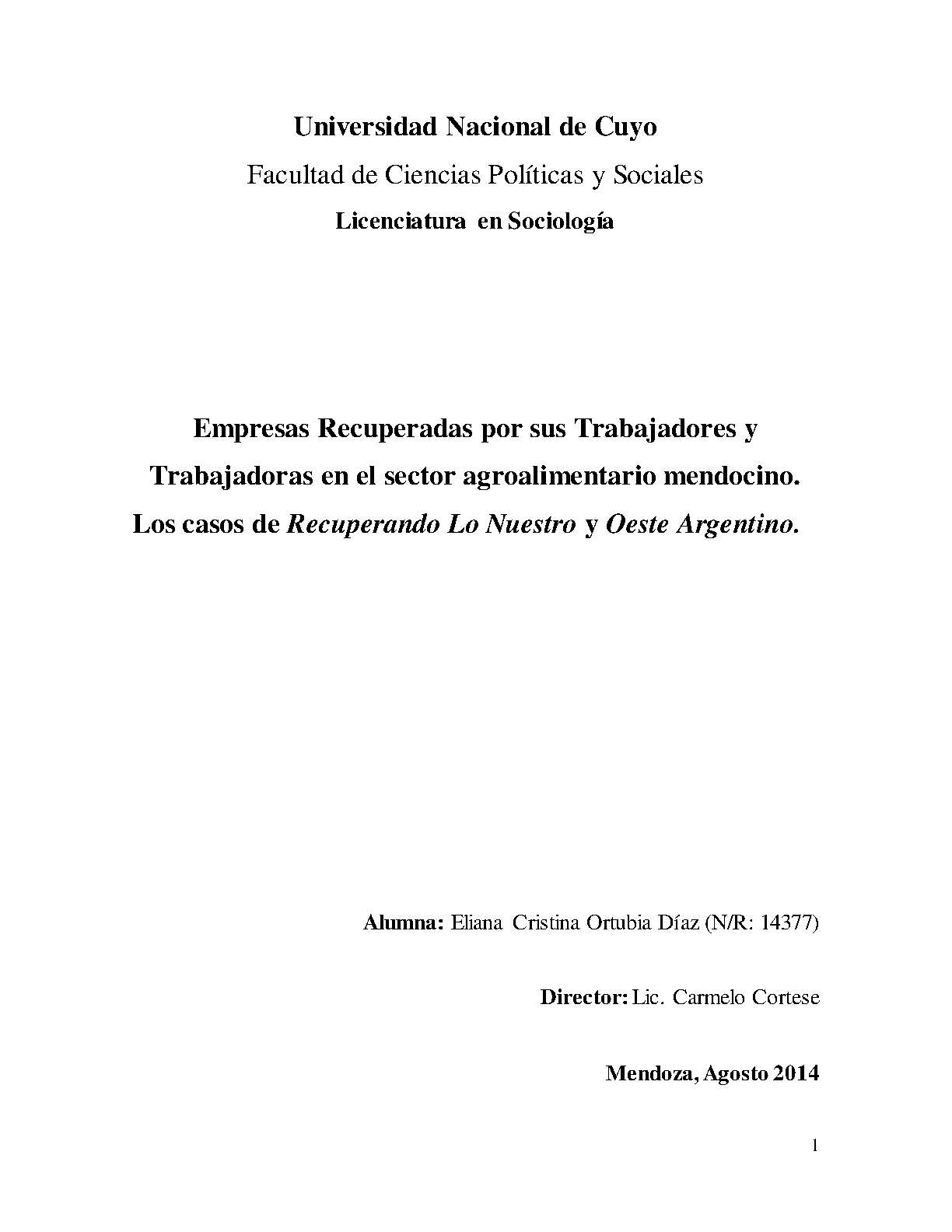 En la provincia de Mendoza se encuentran diferentes experiencias de ERT pertenecientes a sectores económicos diversos, el proceso de recuperación en cada caso ha sido muy variado según el contexto de emergencia de cada empresa. La presente investigación centra la mirada en dos casos pertenecientes al sector agroalimentario, a saber: Recuperando Lo Nuestro (RLN), ex - Ballarini Hnos. ubicada en el departamento de San Rafael y Oeste Argentino (OA), ex – Deman situada en el departamento de Guaymallén. La relevancia histórica del sector agroalimentario en nuestra provincia y el surgimiento de las experiencias anteriormente mencionadas guiaron el estudio a través de los siguientes interrogantes: ¿Qué características adquiere el proceso de recuperación de empresas en la provincia de Mendoza, particularmente en el sector agroalimentario?; ¿En qué contexto socioeconómico se producen las recuperaciones de Oeste Argentino (ex - Demán) y Recuperando Lo Nuestro (ex - Ballarini)?; ¿Cuál es la situación del sector agroalimentario en Mendoza para los años en que se producen las quiebras de las empresas fallidas y luego las recuperaciones?; ¿Cuál es la historia de las dos empresas recuperadas seleccionadas?, ¿Cuáles son sus características y momentos de desarrollo?; y ¿Qué similitudes y diferencias tienen las experiencias autogestivas de Oeste Argentino y Recuperando Lo Nuestro?