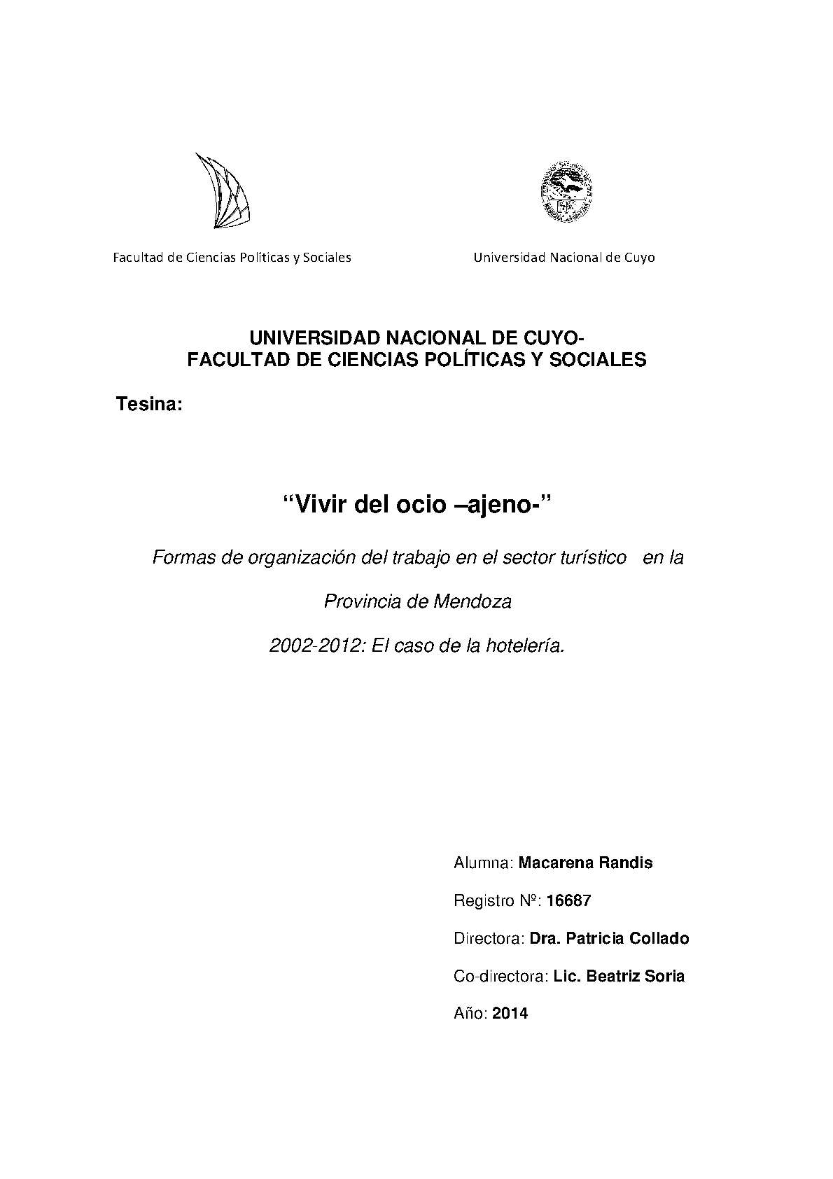 Randis, Macarena. (2014). Vivir del ocio –ajeno-: formas de organización del trabajo en el sector turístico en la Provincia de Mendoza 2002-2012 : el caso de la hotelería (Tesina de grado). Mendoza, Universidad Nacional de Cuyo. Facultad de Ciencias Políticas y Sociales .