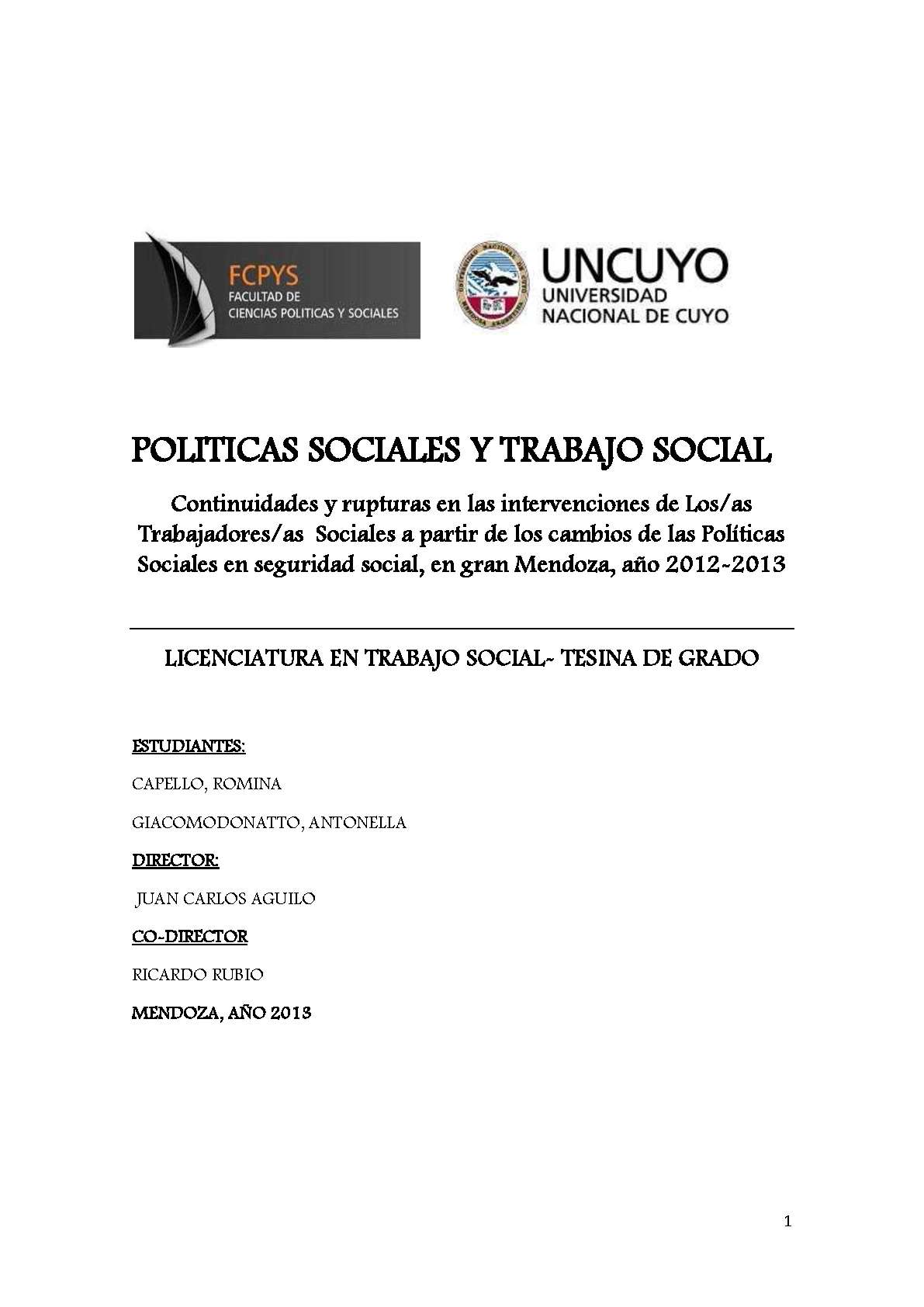 continuidades y rupturas en las intervenciones de Los/as Trabajadores/as Sociales a partir de los cambios de las Políticas Sociales en seguridad social, en gran Mendoza, año 2012-2013