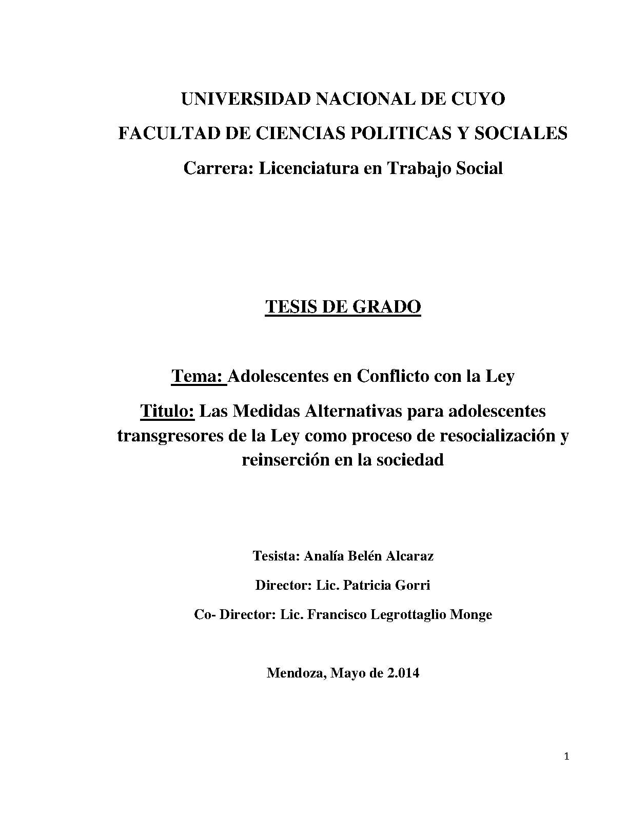 El presente trabajo se realiza en relación a la problemática de los adolescentes, la violencia y el delito en nuestra sociedad, específicamente interesa abordar una problemática que involucra a adolescentes infractores de la ley insertos en el Programa Unidad de Medidas Alternativas (en adelante U.M.A.) del Valle de Uco de Mendoza.