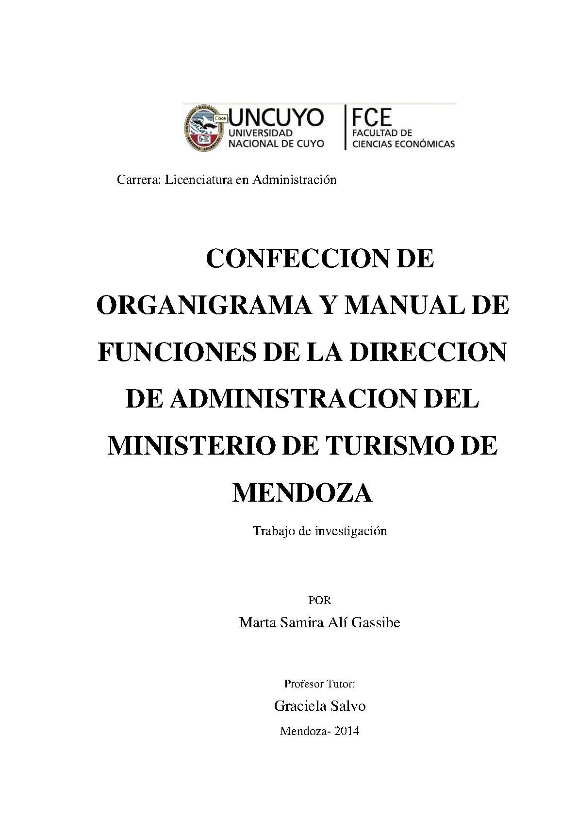 Alí Gassibe, Marta Samira. (2014). Confección de organigrama y manual de funciones de la Dirección de Administración del Ministerio de Turismo de Mendoza: trabajo de investigación (Trabajo final de grado). Mendoza, Universidad Nacional de Cuyo. Facultad de Ciencias Económicas.