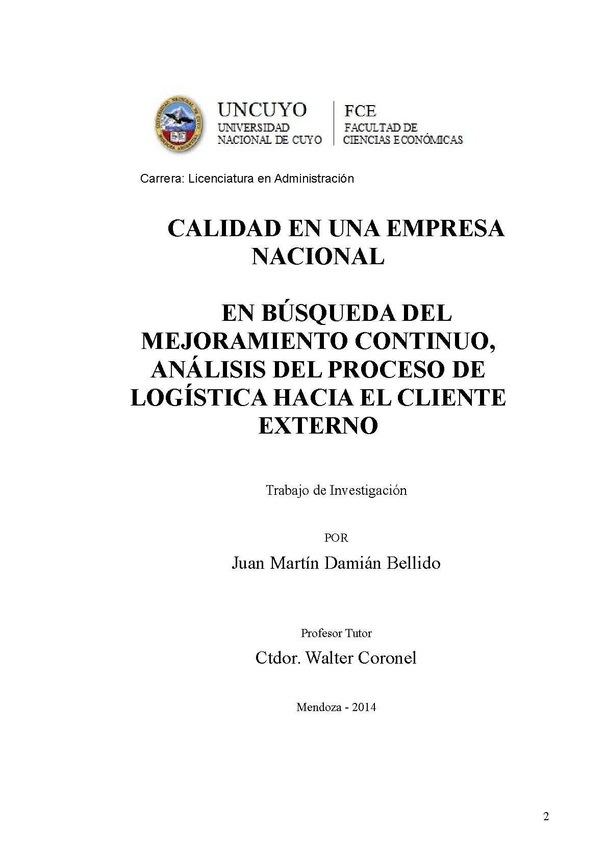Bellido, Juan Martín Damián. (2014). Calidad en una empresa nacional: en búsqueda el mejoramiento continuo : análisis del proceso de logística hacia el cliente externo (Trabajo final de grado). Mendoza, Universidad Nacional de Cuyo. Facultad de Ciencias Económicas.