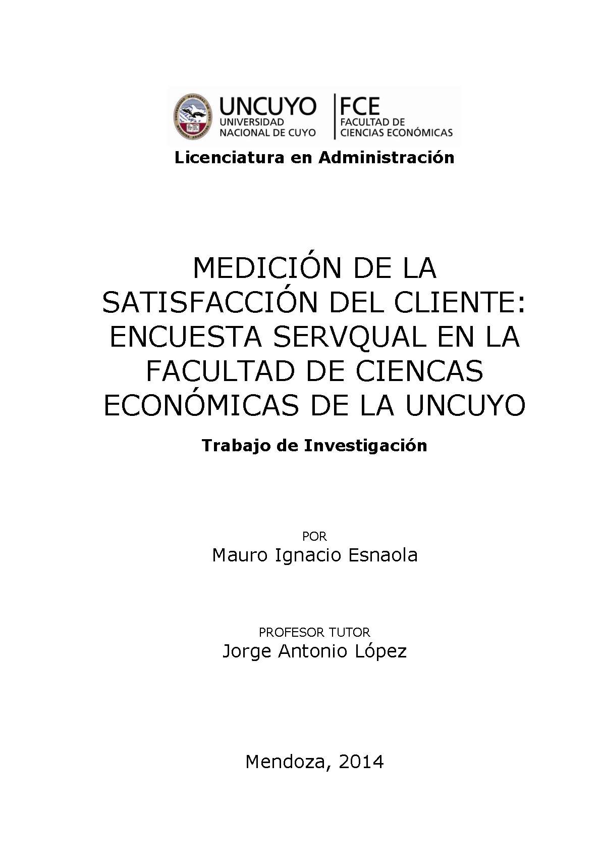 Esnaola, Mauro Ignacio. (2014). Medición de la satisfacción del cliente: encuesta SERVQUAL en la Facultad de Ciencias Económicas de la UNCuyo (Trabajo final de grado). Mendoza, Universidad Nacional de Cuyo. Facultad de Ciencias Económicas.