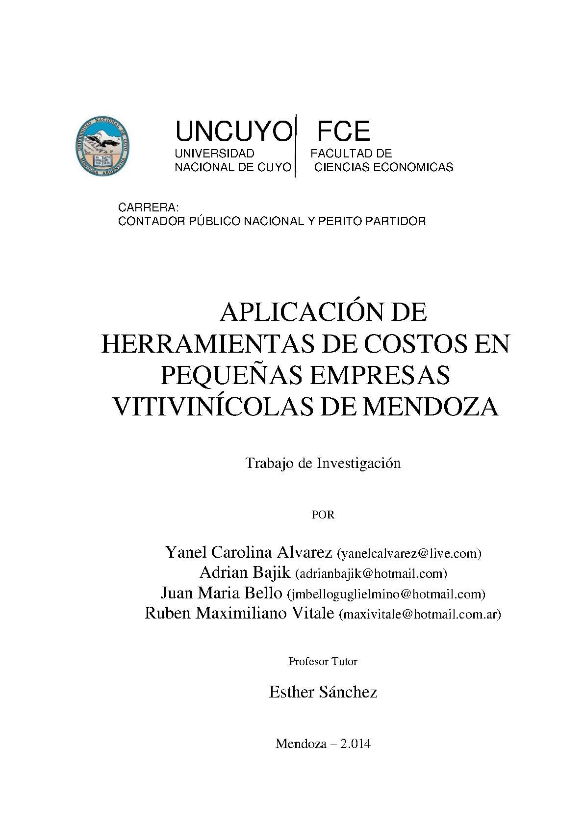 Alvarez, Yanel Carolina; Bajik, Adrián; Bello, Juan Maria; Vitale, Rubén Maximiliano. (2014). Aplicación de herramientas de costos en pequeñas empresas vitivinícolas de Mendoza: trabajo de investigación (Trabajo final de grado). Mendoza, Universidad Nacional de Cuyo. Facultad de Ciencias Económicas.