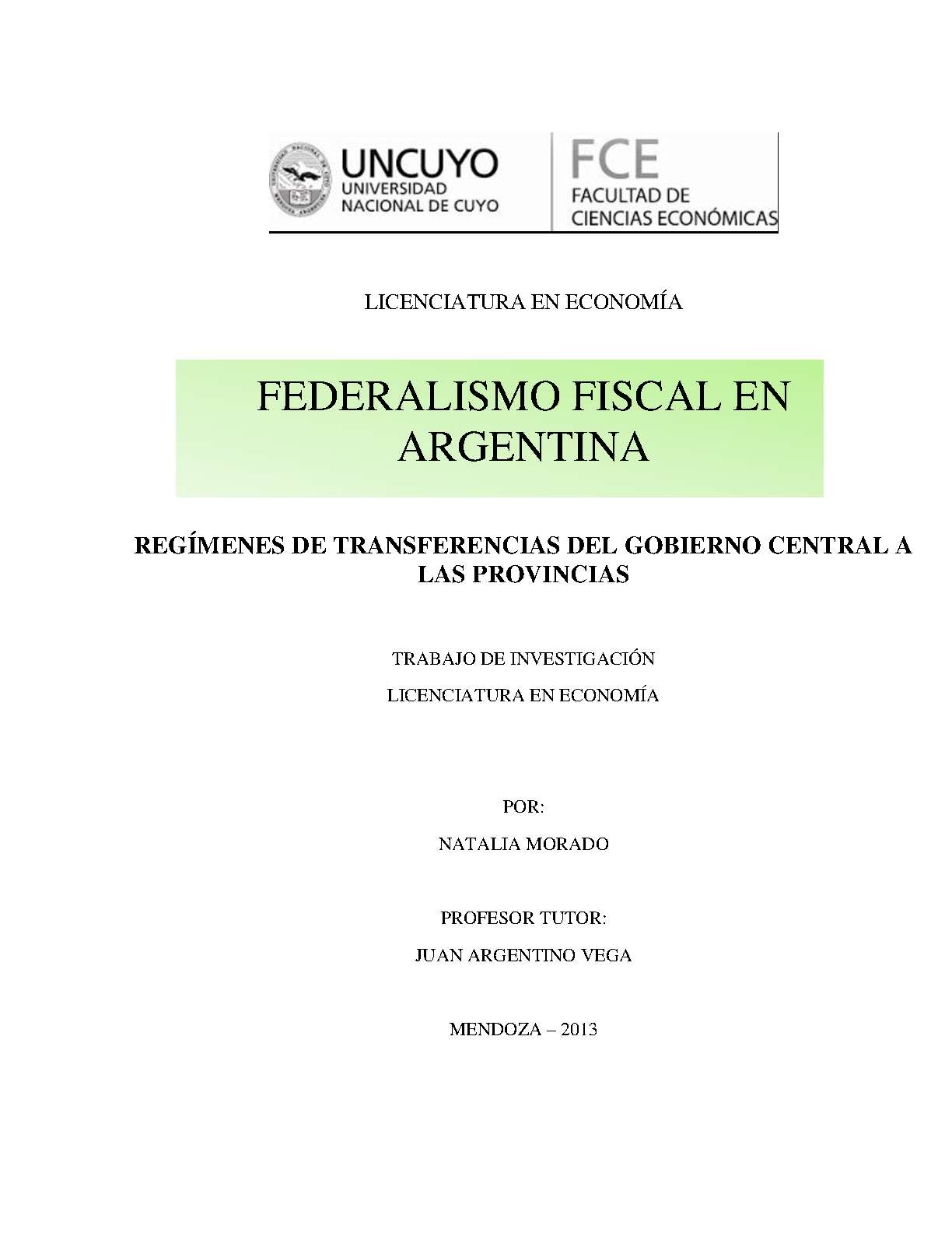 Morado, Natalia. (2014). Federalismo fiscal en Argentina: regímenes de transferencias del gobierno central a las provincias (Trabajo final de grado). Mendoza, Universidad Nacional de Cuyo. Facultad de Ciencias Económicas.
