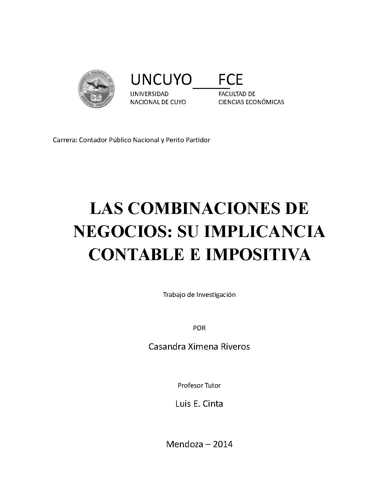 Riveros, Casandra Ximena. (2014). Las combinaciones de negocios: su implicancia contable e impositiva (Trabajo final de grado). Mendoza, Universidad Nacional de Cuyo. Facultad de Ciencias Económicas.