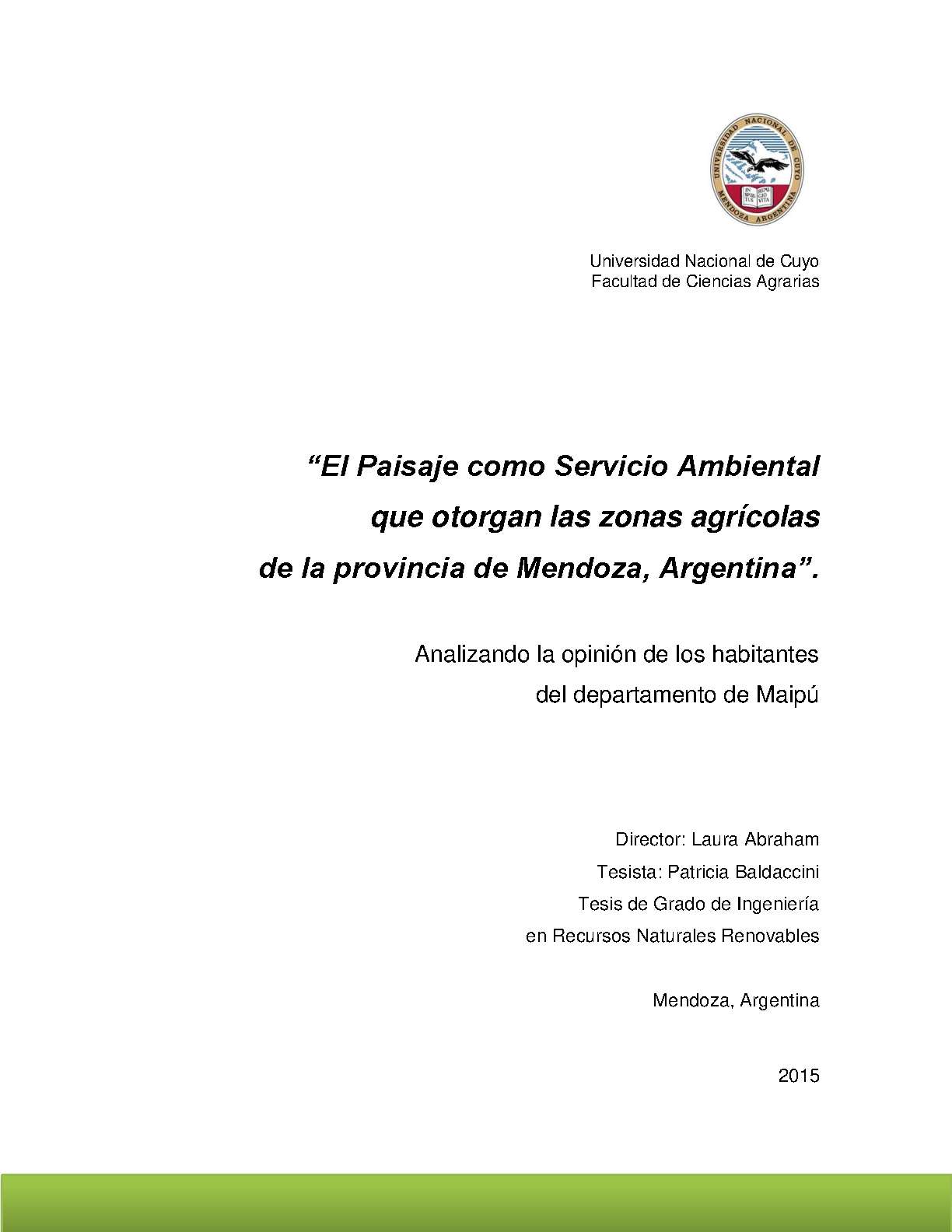 Baldaccini, Patricia. (2015). El Paisaje como Servicio Ambiental que otorgan las zonas agrícolas de la provincia de Mendoza, Argentina: Analizando la opinión de los habitantes del departamento de Maipú (Tesina de grado). Mendoza, Universidad Nacional de Cuyo. Facultad de Ciencias Agrarias .