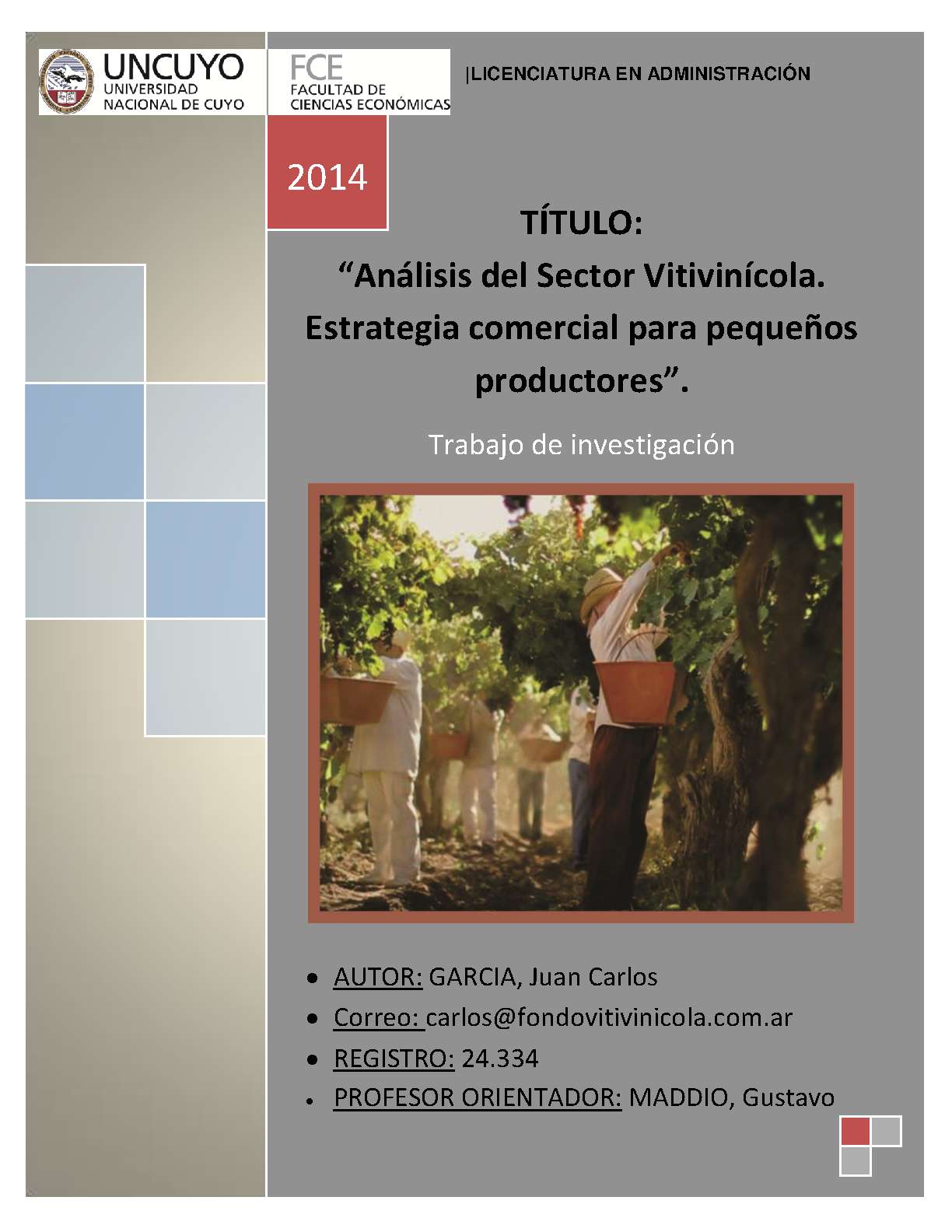 García, Juan Carlos. (2014). Análisis del sector vitivinícola: estrategia comercial para pequeños productores (Trabajo final de grado). Mendoza, Universidad Nacional de Cuyo. Facultad de Ciencias Económicas.