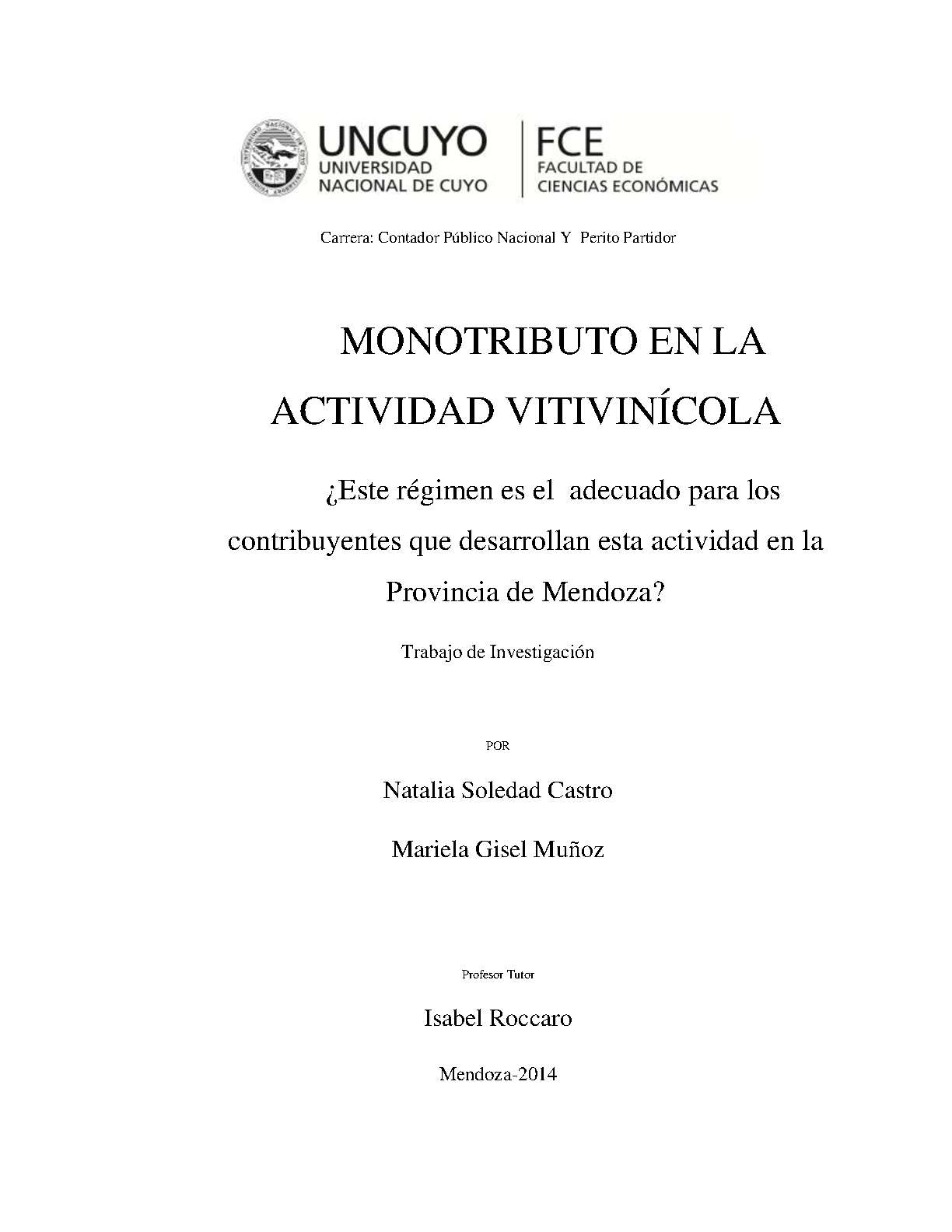 Partiendo de la importancia del desarrollo de la vitivinicultura en la Provincia de Mendoza y de que no se encuentran contribuyentes en esta actividad registrados como Monotributistas, el objetivo primordial de este trabajo radica en determinar los beneficios que les daría estar inscripto a aquellos que no lo están y las dificultades que se les presentan, a los distintos agentes que intervienen el sector, para dar cumplimiento a los requisitos establecidos y que hace que queden fuera de este régimen, investigando el funcionamiento del Régimen Simplificado para Pequeños Contribuyentes, también llamado “Monotributo" especialmente en la Actividad Vitivinícola desarrollada en la Provincia de Mendoza.