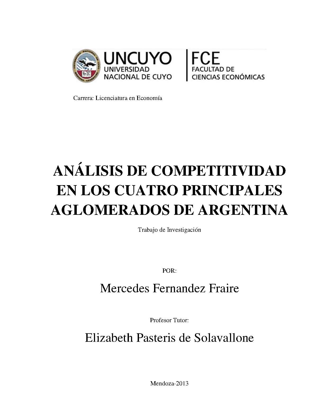Fernández Fraire, Mercedes. (2013). Análisis de competitividad en los cuatro principales aglomerados de Argentina: (Trabajo final de grado). Mendoza, Universidad Nacional de Cuyo. Facultad de Ciencias Económicas.