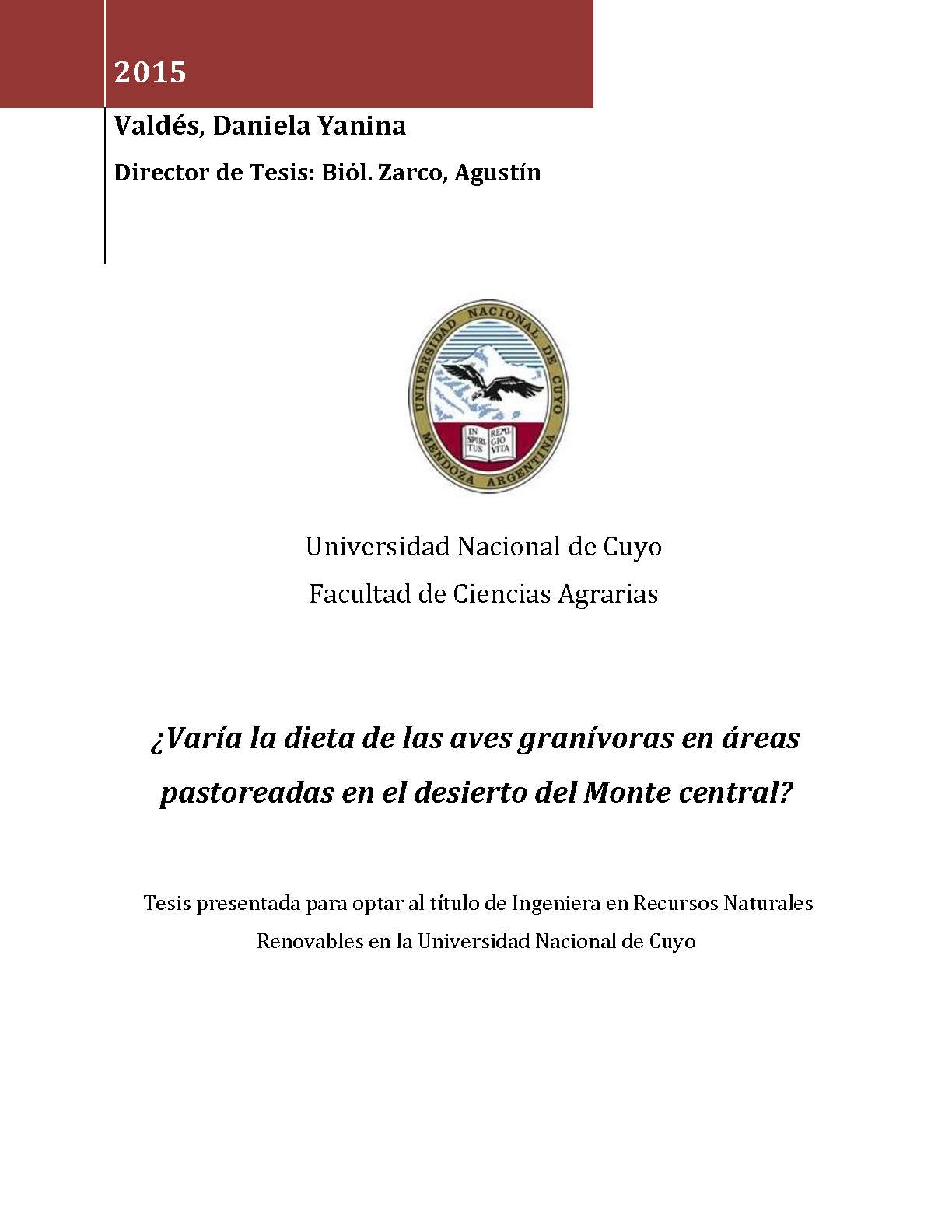 Valdés, Daniela Yanina. (2015). ¿Varía la dieta de las aves granívoras en áreas pastoreadas en el desierto del Monte central?: (Tesina de grado). Mendoza, Universidad Nacional de Cuyo. Facultad de Ciencias Agrarias .