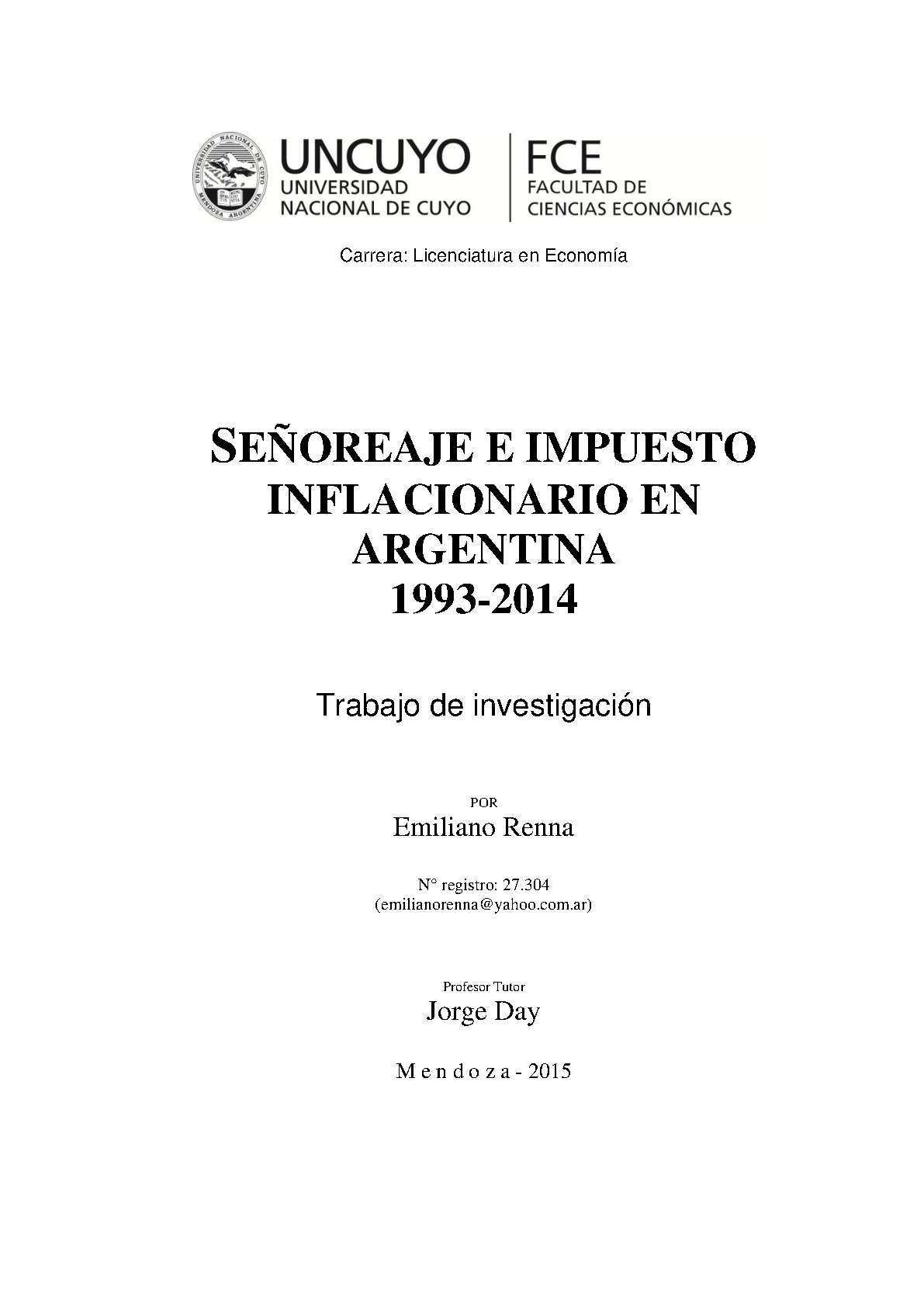 Renna, Emiliano. (2015). Señoreaje e impuesto inflacionario en Argentina 1993-2014: (Trabajo final de grado). Mendoza, Universidad Nacional de Cuyo. Facultad de Ciencias Económicas.