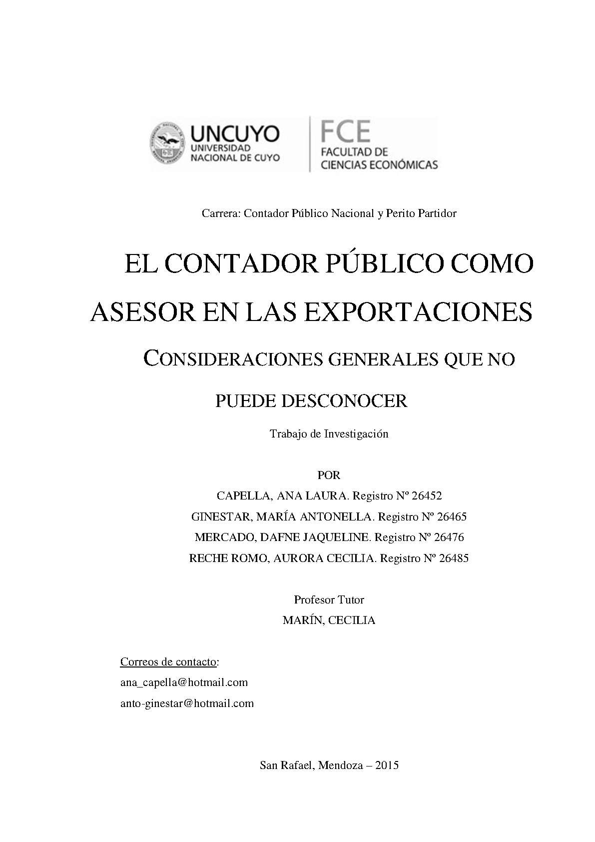 El objetivo de este trabajo es ampliar los conocimientos en el rol del Contador Público relacionado con las exportaciones, ya que si bien no es tenida en cuenta como una labor corriente de los profesionales, consideramos que puede ser un importante campo de aplicación debido a que el intercambio y el comercio se han vuelto más transnacionales, siendo el comercio exterior uno de los principales motores del crecimiento.