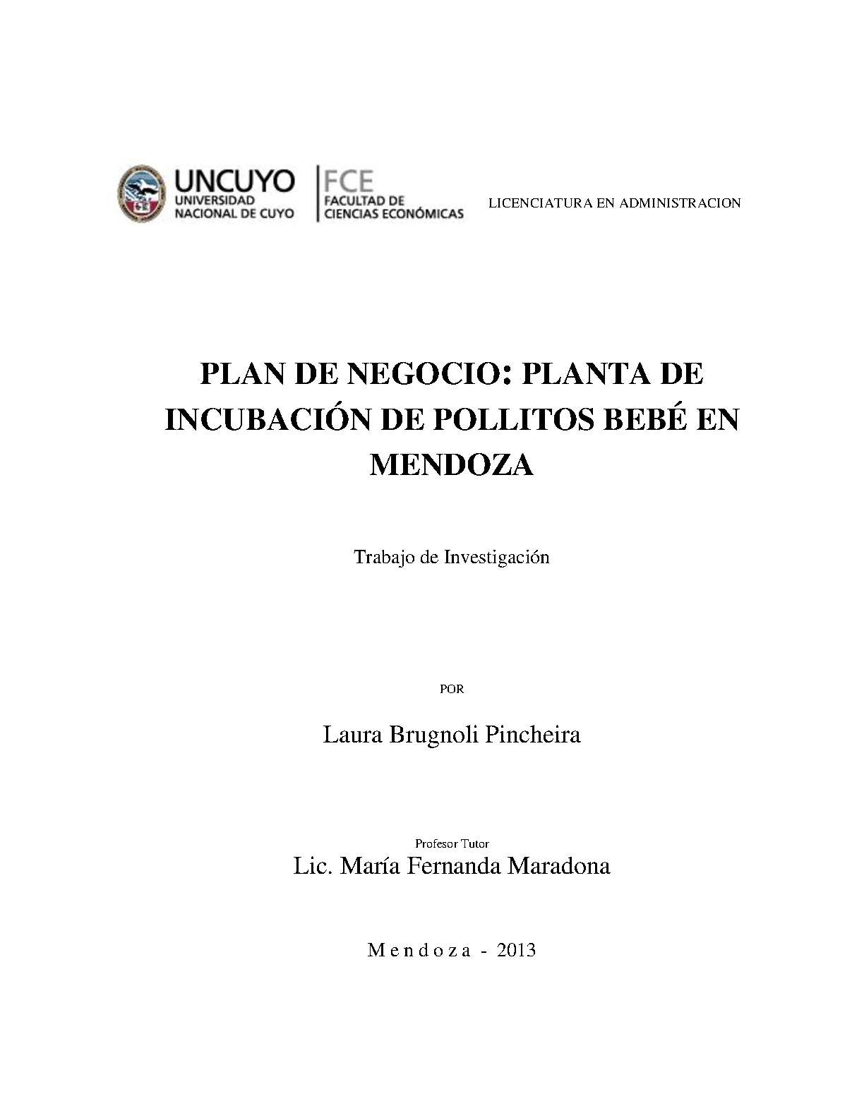 Brugnoli Pincheira, Laura. (2013). Plan de negocios: planta de incubación de pollitos bebé en Mendoza (Trabajo final de grado). Mendoza, Universidad Nacional de Cuyo. Facultad de Ciencias Económicas.