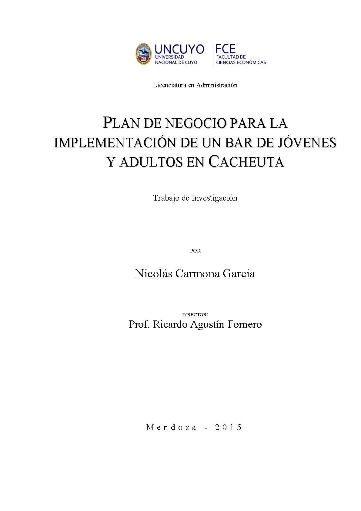 Carmona García, Nicolás. (2015). Plan de negocio para la implementación de un bar de jóvenes y adultos en Cacheuta: (Trabajo final de grado). Mendoza, Universidad Nacional de Cuyo. Facultad de Ciencias Económicas.