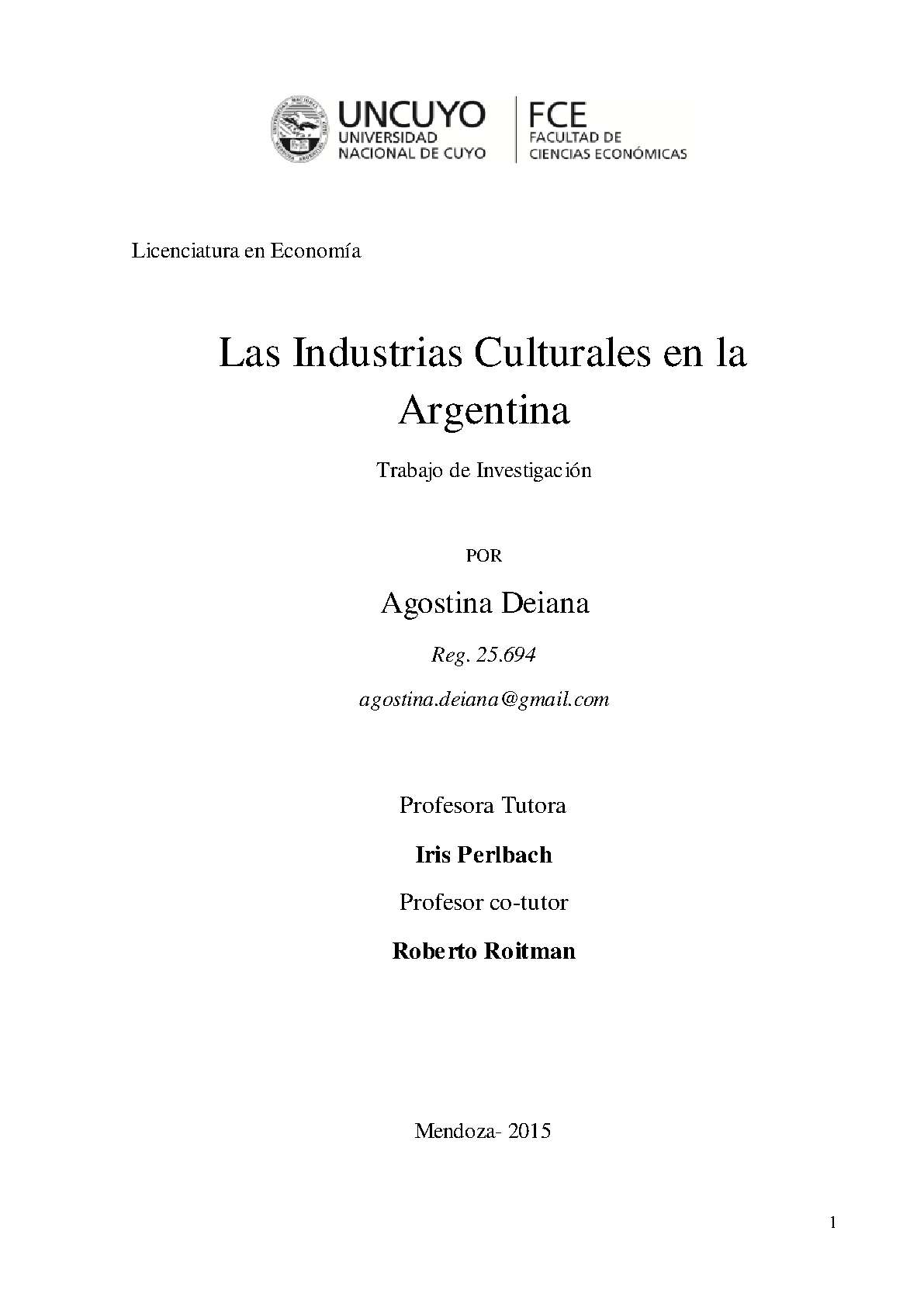 Deiana, Agostina. (2015). Las industrias culturales en la Argentina: (Trabajo final de grado). Mendoza, Universidad Nacional de Cuyo. Facultad de Ciencias Económicas.