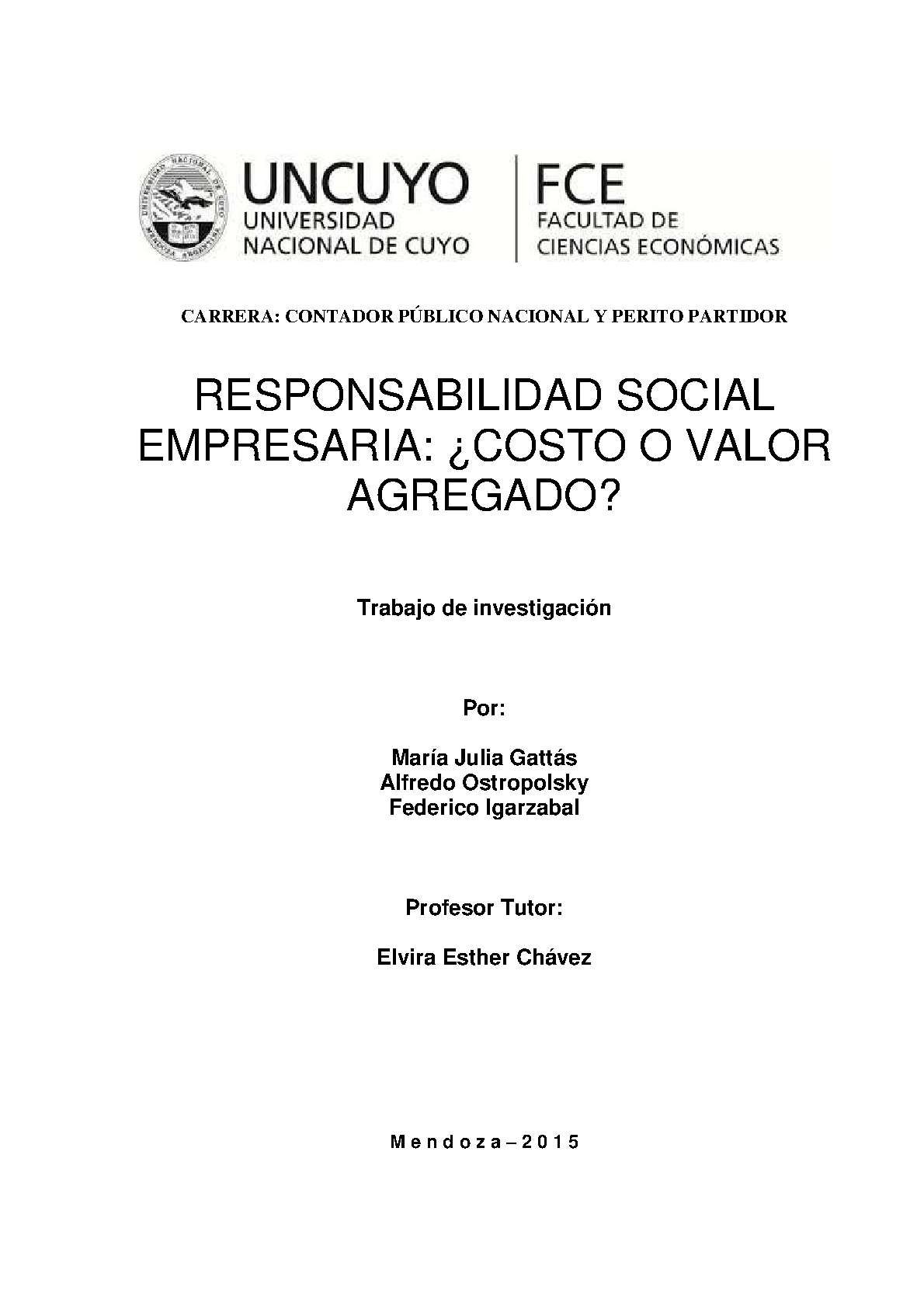Gattás, María Julia; Ostropolsky, Alfredo Ariel ; Igarzabal, Federico. (2014). Responsabilidad social empresaria: ¿costo o valor agregado? (Trabajo final de grado). Mendoza, Universidad Nacional de Cuyo. Facultad de Ciencias Económicas.