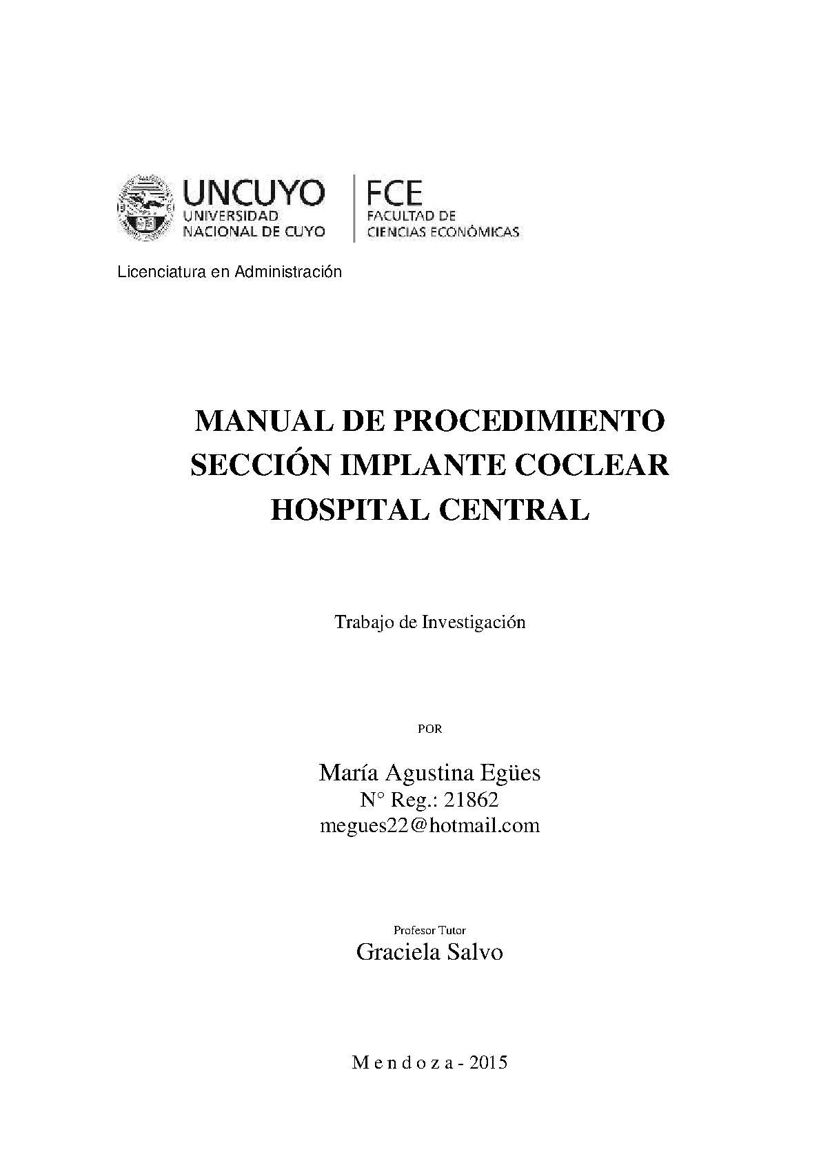 Egües Almeida, María Agustina. (2015). Manual de procedimiento Sección Implante Coclear Hospital Central: (Trabajo final de grado). Mendoza, Universidad Nacional de Cuyo. Facultad de Ciencias Económicas.