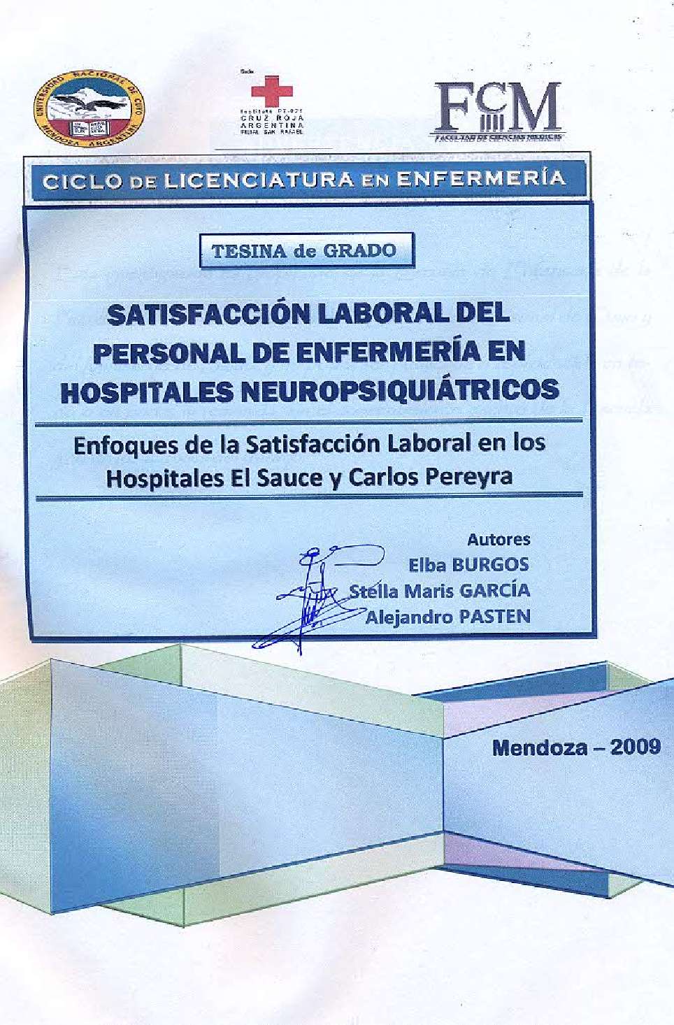 Burgos, Elba; García, Stella Maris; Pasten, Alejandro. (2009). Satisfacción laboral del personal de enfermería en hospitales neuropsiquiátricos: enfoques de la satisfacción laboral en los hospitales El Sauce y Carlos Pereyra (Tesina de grado). Mendoza, Universidad Nacional de Cuyo. Facultad de Ciencias Médicas. Escuela de Enfermería..