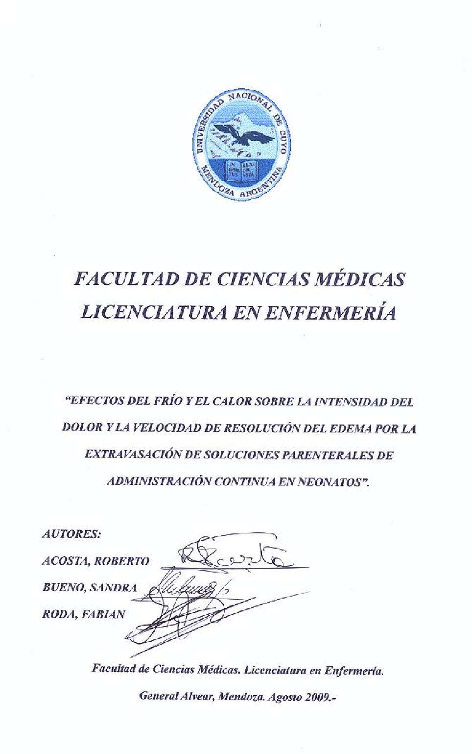 Acosta, Roberto; Bueno, Sandra; Roda, Fabián. (2009). Efectos del frío y el calor sobre la intensidad del dolor y la velocidad de resolución del edema por la extravasación de soluciones parentales de la administración continua en neonatos: (Tesina de grado). Mendoza, Universidad Nacional de Cuyo. Facultad de Ciencias Médicas. Escuela de Enfermería..