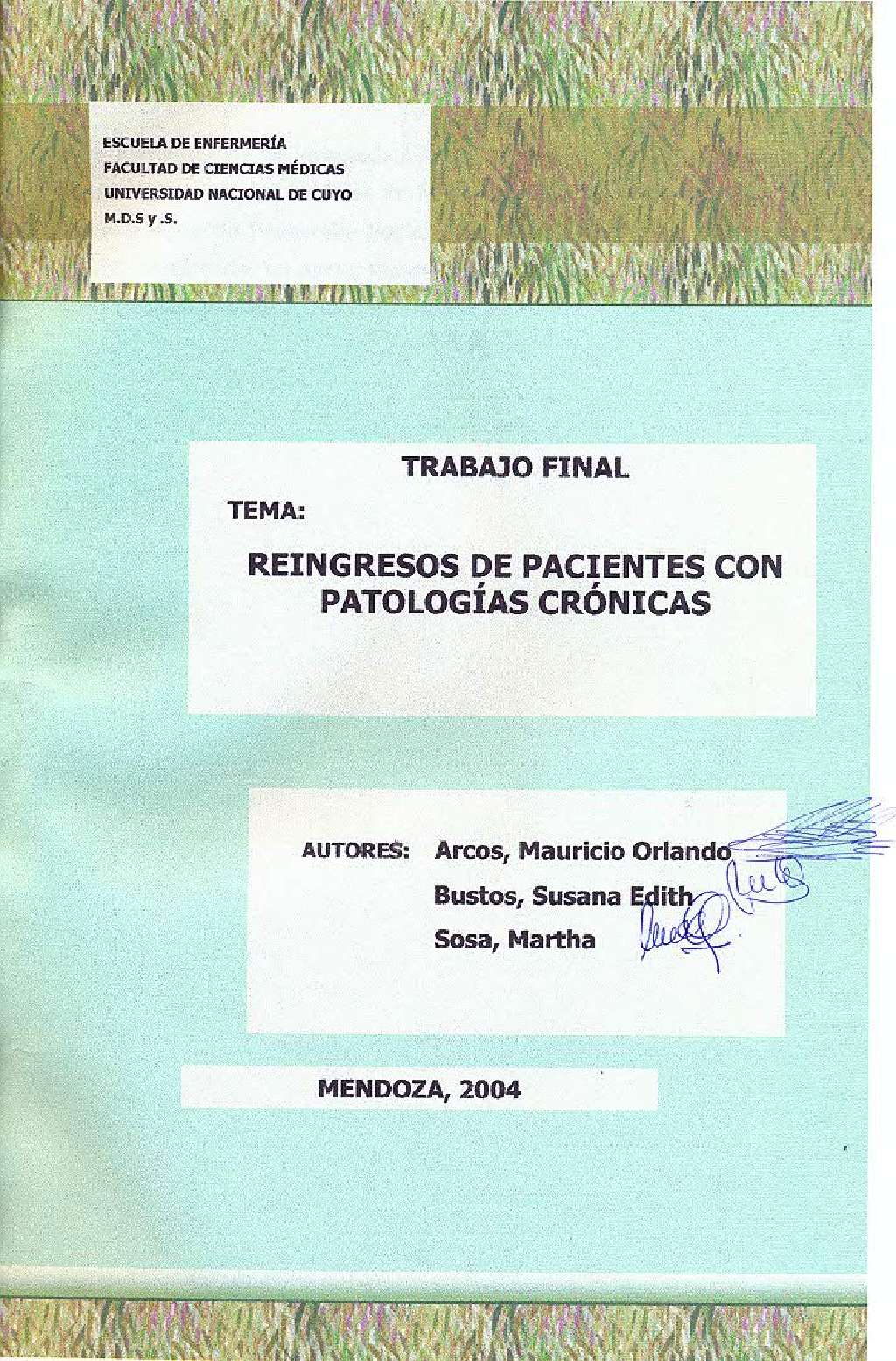 Arcos, Mauricio Orlando; Bustos, Susana Edith; Sosa, Marta. (2004). Reingresos de pacientes con patologías crónicas: (Tesina de grado). Mendoza, Universidad Nacional de Cuyo. Facultad de Ciencias Médicas. Escuela de Enfermería..