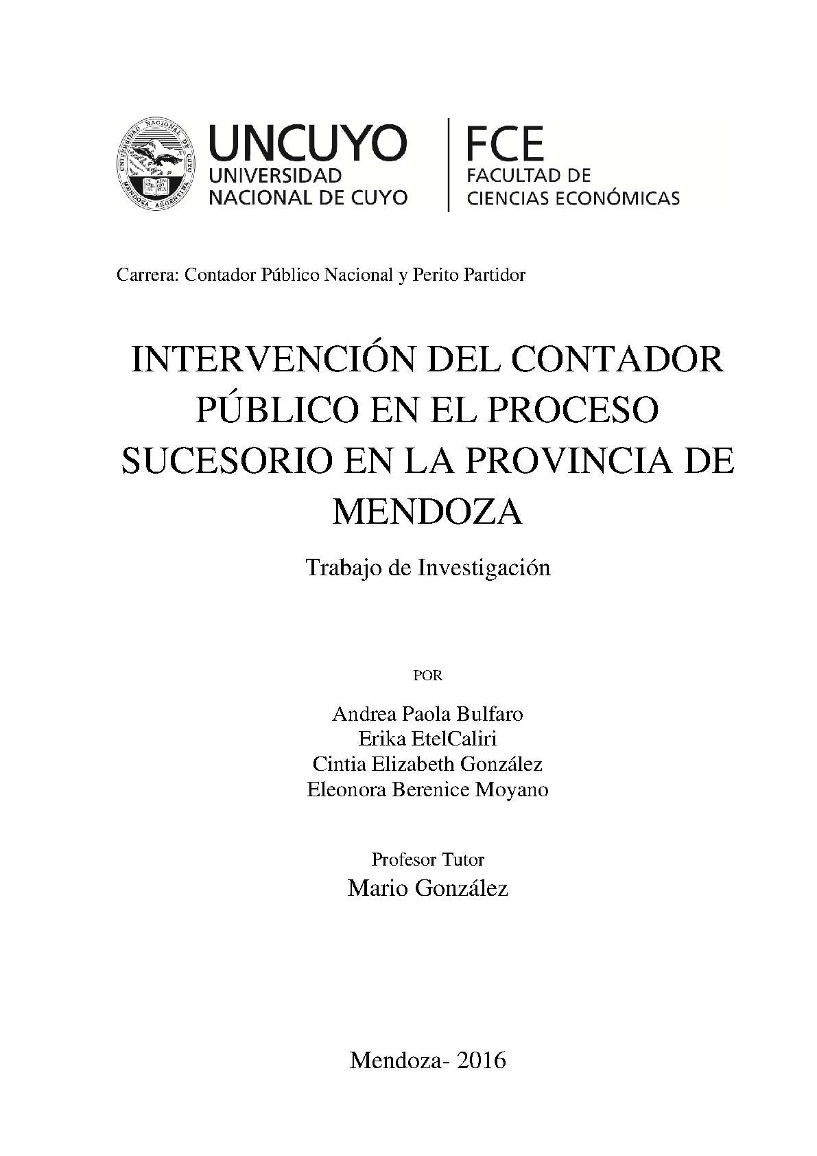 Bulfaro, Andrea Paola; Caliri, Erika Etel; Gonzalez, Cintia Elizabeth; Moyano, Eleonora Berenice. (2016). Intervención del contador público en el proceso sucesorio en la provincia de Mendoza : (Trabajo final de grado). Mendoza, Universidad Nacional de Cuyo. Facultad de Ciencias Económicas.