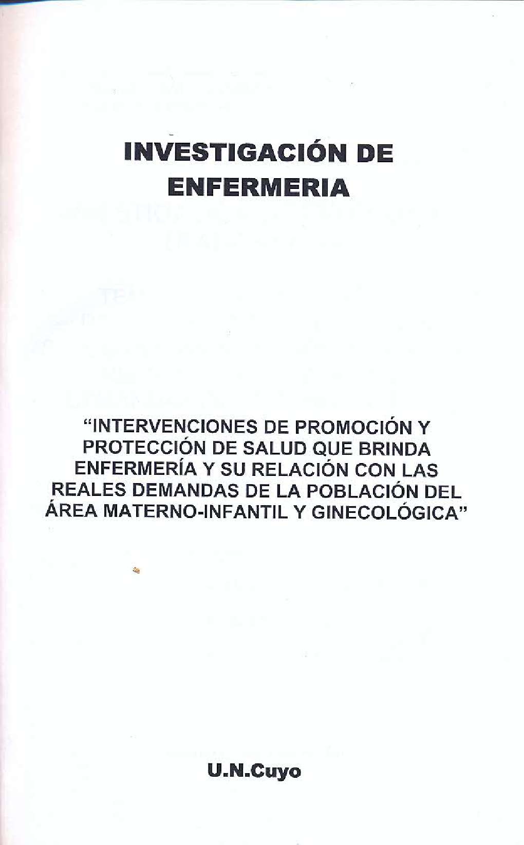 Mendez, Carolina; Román, Lourdes; Soto, Darwin. (2008). Intervenciones de promoción y protección de la salud que brinda enfermería y su relación con las reales demandas de la población del área materno-infantil y ginecológica: (Tesina de grado). Mendoza, Universidad Nacional de Cuyo. Facultad de Ciencias Médicas. Escuela de Enfermería..