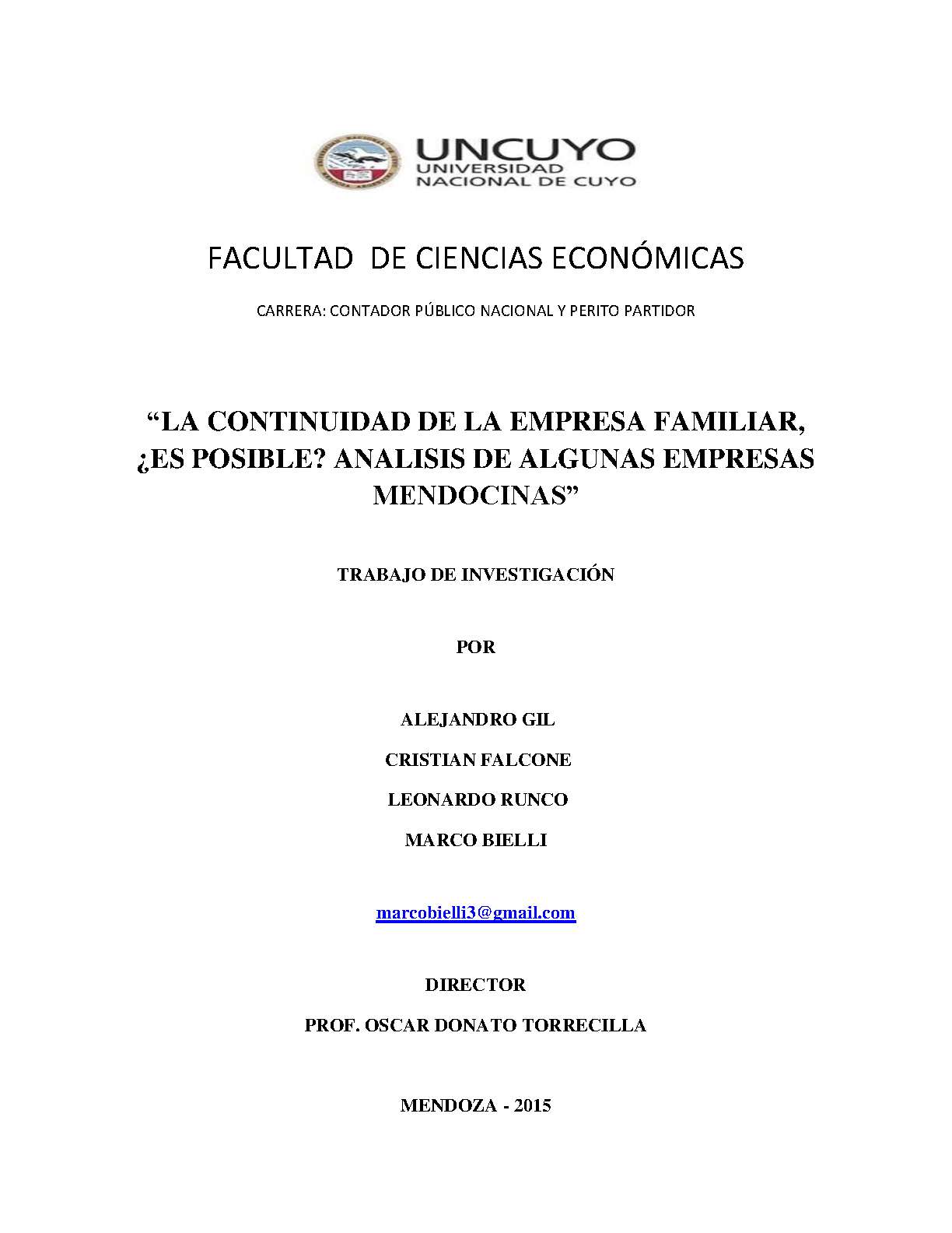 Gil, Alejandro; Falcone, Cristian; Runco, Leonardo; Bielli, Marco. (2015). La continuidad de la empresa familiar, ¿es posible?: análisis de algunas empresas mendocinas (Trabajo final de grado). Mendoza, Universidad Nacional de Cuyo. Facultad de Ciencias Económicas. Delegación San Rafael.