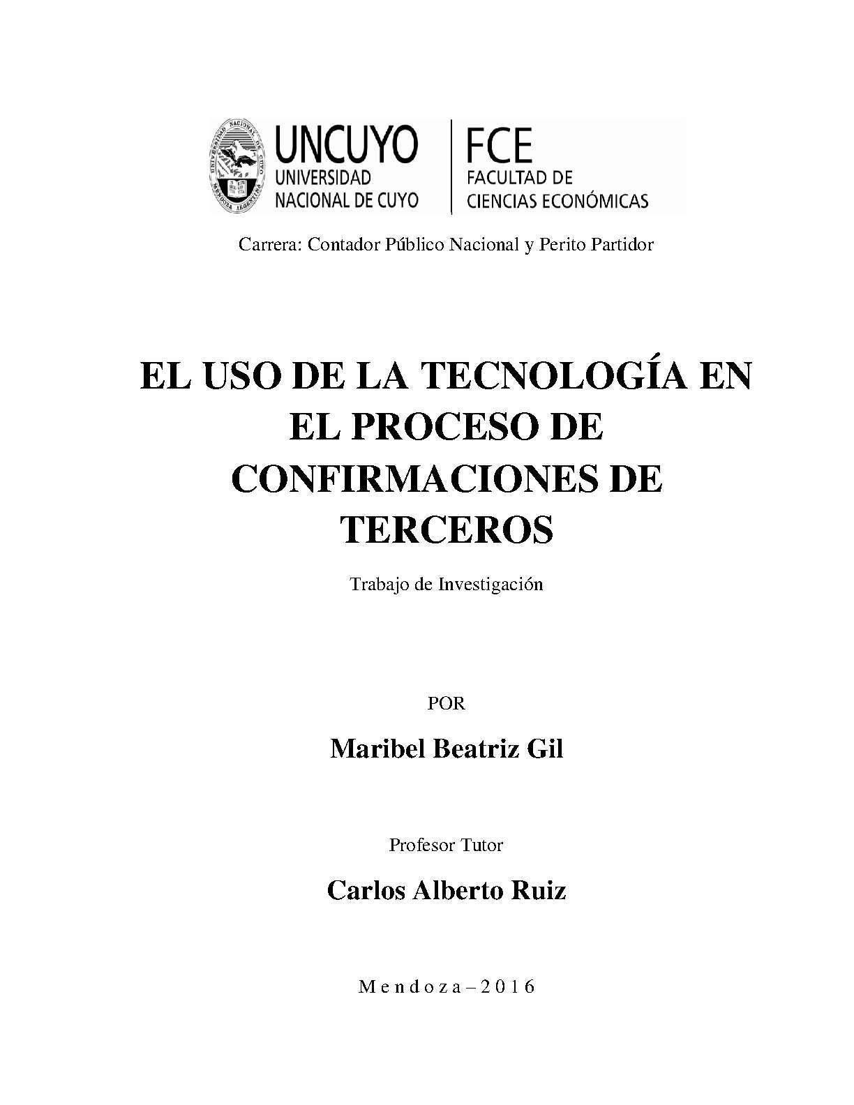 Gil, Maribel Beatriz. (2016). El uso de la tecnología en el proceso de confirmaciones de terceros: (Tesina de grado). Mendoza, Universidad Nacional de Cuyo. Facultad de Ciencias Económicas.