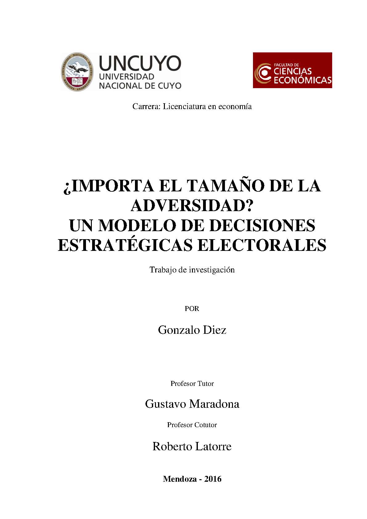 Diez, Gonzalo Gabriel. (2016). ¿Importa el tamaño de la adversidad? : un modelo de decisiones estratégicas electorales (Tesina de grado). Mendoza, Universidad Nacional de Cuyo. Facultad de Ciencias Económicas.