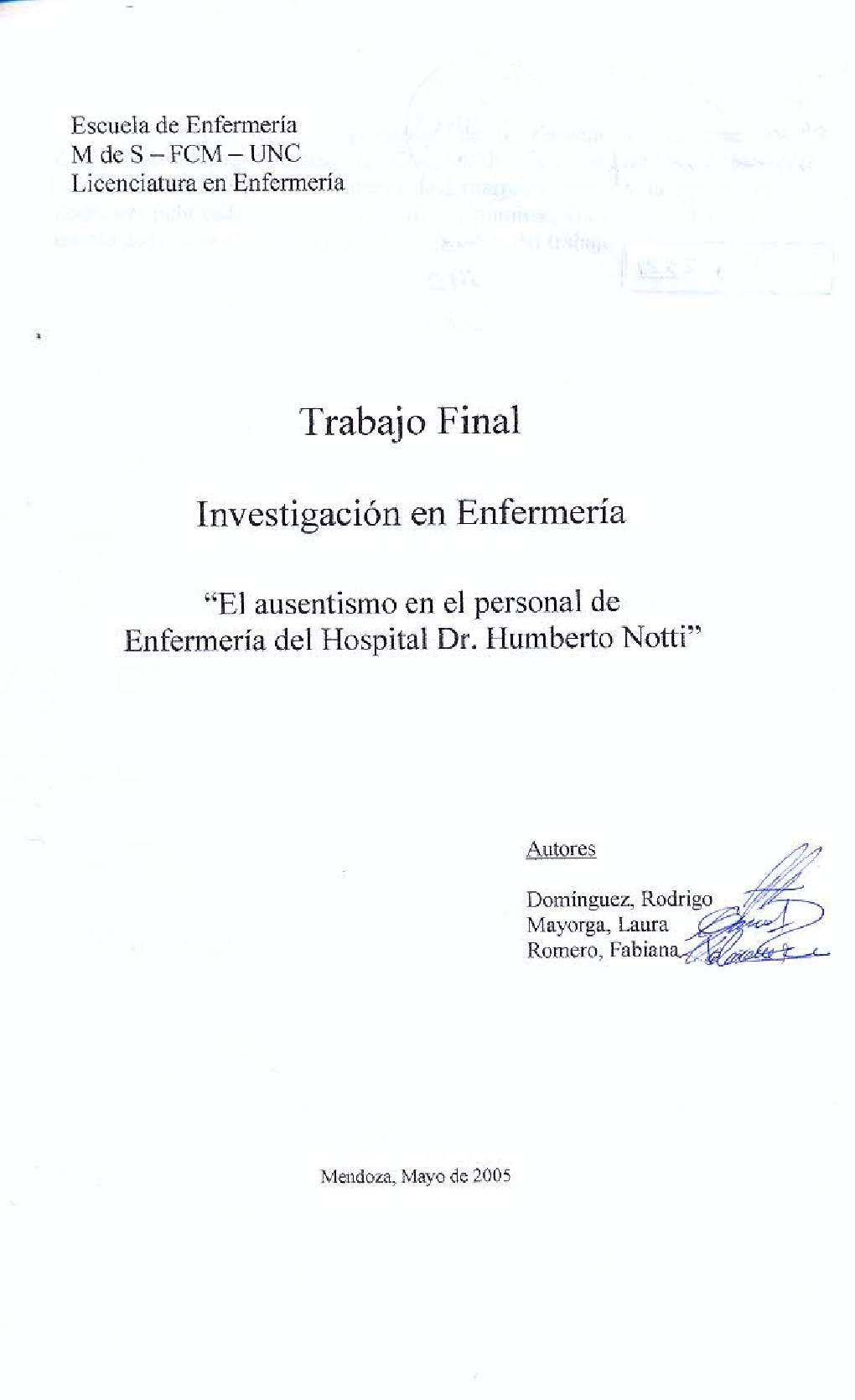 Domínguez, Rodrigo; Mayorga, Laura; Romero, Fabiana. (2005). El ausentismo en el personal de enfermería del Hospital Humberto Notti: (Tesina de grado). Mendoza, Universidad Nacional de Cuyo. Facultad de Ciencias Médicas. Escuela de Enfermería..