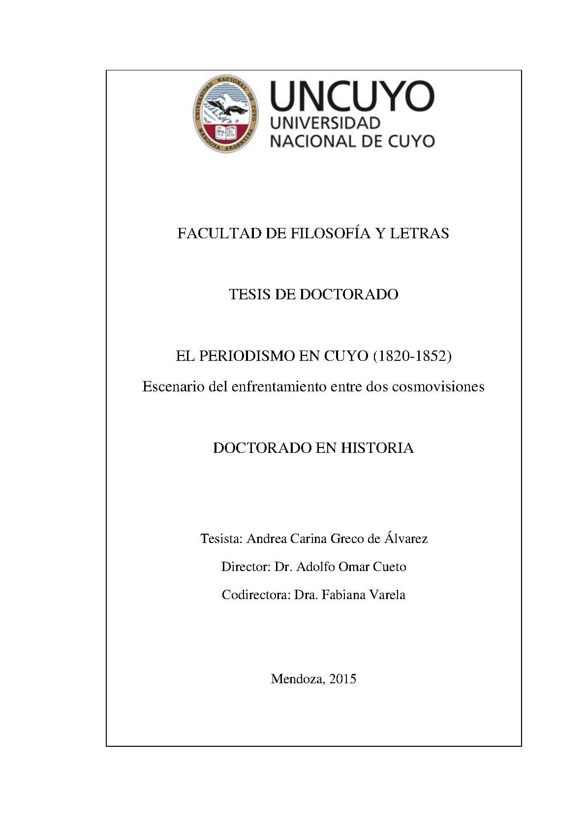 Greco, Andrea. (2015). El periodismo en Cuyo (1820-1852): escenario del enfrentamiento entre dos cosmovisiones (Tesis de Doctorado). Mendoza, Universidad Nacional de Cuyo. Facultad de Filosofía y Letras .